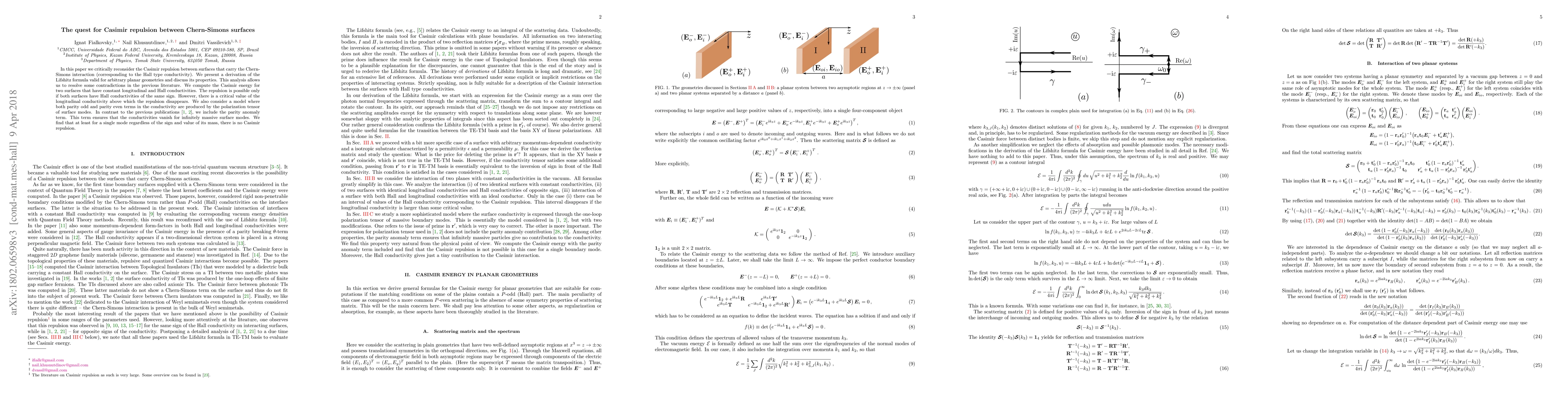 In this paper we critically reconsider the Casimir repulsion between surfaces that carry the Chern-Simons interaction (corresponding to the Hall type conductivity). We present a derivation of the Lifshitz formula valid for arbitrary planar geometries and discuss its properties. This analysis allows us to resolve some contradictions in the previous literature. We compute the Casimir energy for two surfaces that have constant longitudinal and Hall conductivities. The repulsion is possible only if both surfaces have Hall conductivities of the same sign. However, there is a critical value of the longitudinal conductivity above which the repulsion disappears. We also consider a model where both parity odd and parity even terms in the conductivity are produced by the polarization tensor of surface modes. In contrast to the previous publications L. Chen and S.-L. Wan, Phys. Rev. B84, 075149 (2011); B85, 115102 (2012), we include the parity anomaly term. This term ensures that the conductivities vanish for infinitely massive surface modes. We find that at least for a single mode regardless of the sign and value of its mass, there is no Casimir repulsion.