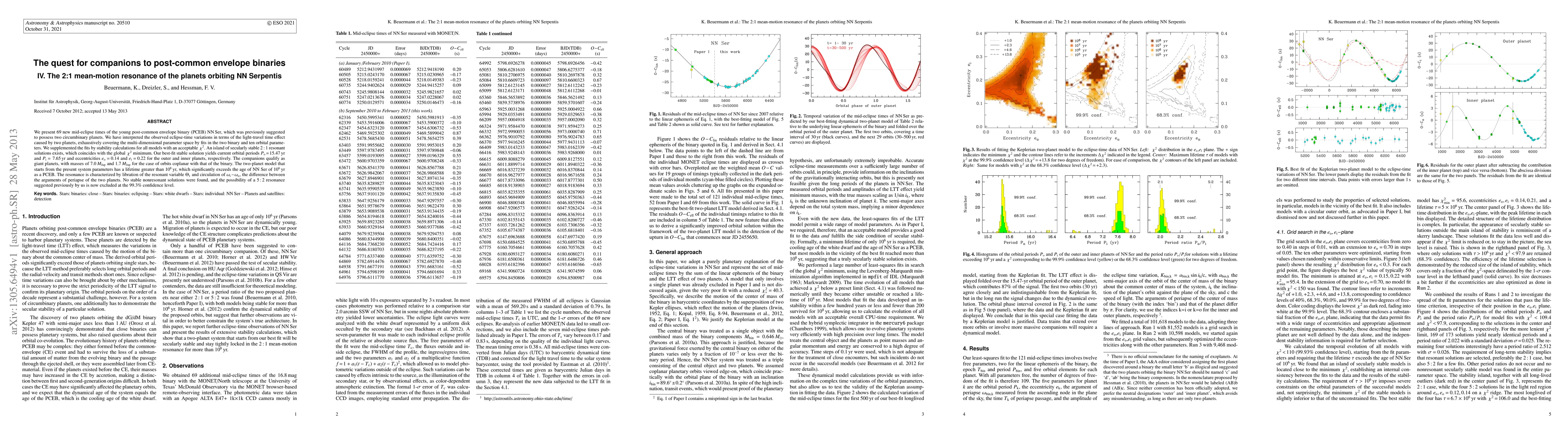 We present 69 new mid-eclipse times of the young post-common envelope binary (PCEB) NN Ser, which was previously suggested to possess two circumbinary planets. We have interpreted the observed eclipse-time variations in terms of the light-travel time effect caused by two planets, exhaustively covering the multi-dimensional parameter space by fits in the two binary and ten orbital parameters. We supplemented the fits by stability calculations for all models with an acceptable chi-square. An island of secularly stable 2:1 resonant solutions exists, which coincides with the global chi-square minimum. Our best-fit stable solution yields current orbital periods P_o = 15.47 yr and P_i = 7.65 yr and eccentricities e_o = 0.14 and e_i = 0.22 for the outer (o) and inner (i) planets, respectively. The companions qualify as giant planets, with masses of 7.0 M_Jup and 1.7 M_Jup for the case of orbits coplanar with that of the binary. The two-planet model that starts from the present system parameters has a lifetime greater than 10^8 yr, which significantly exceeds the age of NN Ser of 10^6 yr as a PCEB. The resonance is characterized by libration of the resonant variable Theta_1 and circulation of omega_i-omega_o, the difference between the arguments of periapse of the two planets. No stable non-resonant solutions were found, and the possibility of a 5:2 resonance suggested previously by us is now excluded at the 99.3% confidence level.