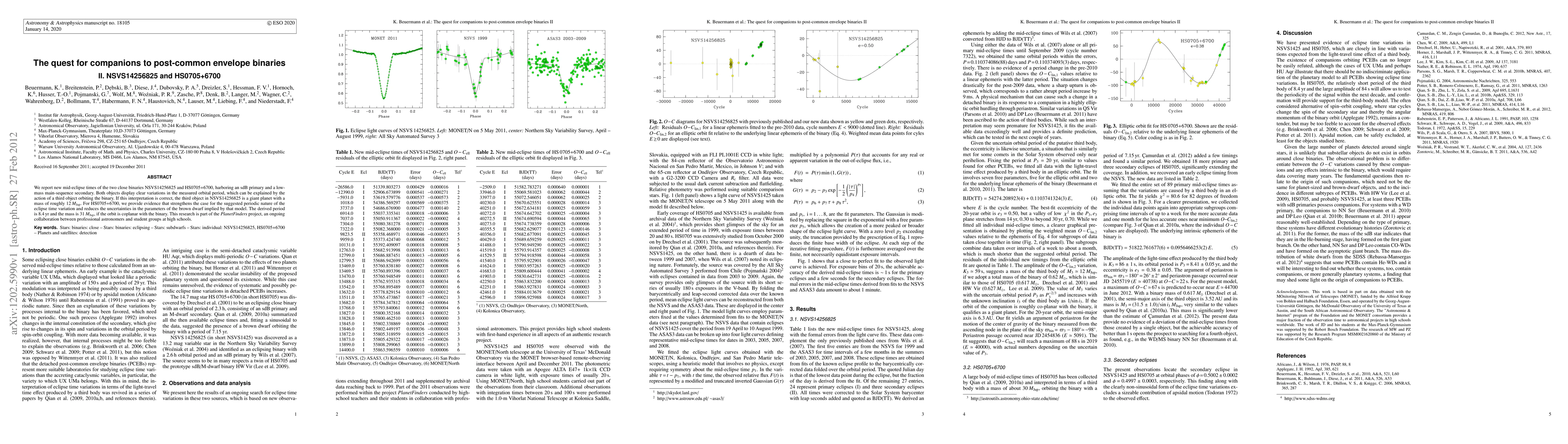 We report new mid-eclipse times of the two close binaries NSVS14256825 and HS0705+6700, harboring an sdB primary and a low-mass main-sequence secondary. Both objects display clear variations in the measured orbital period, which can be explained by the action of a third object orbiting the binary. If this interpretation is correct, the third object in NSVS14256825 is a giant planet with a mass of roughly 12 M_Jup. For HS0705+6700, we provide evidence that strengthens the case for the suggested periodic nature of the eclipse time variation and reduces the uncertainties in the parameters of the brown dwarf implied by that model. The derived period is 8.4 yr and the mass is 31 M_Jup, if the orbit is coplanar with the binary. This research is part of the PlanetFinders project, an ongoing collaboration between professional astronomers and student groups at high schools.