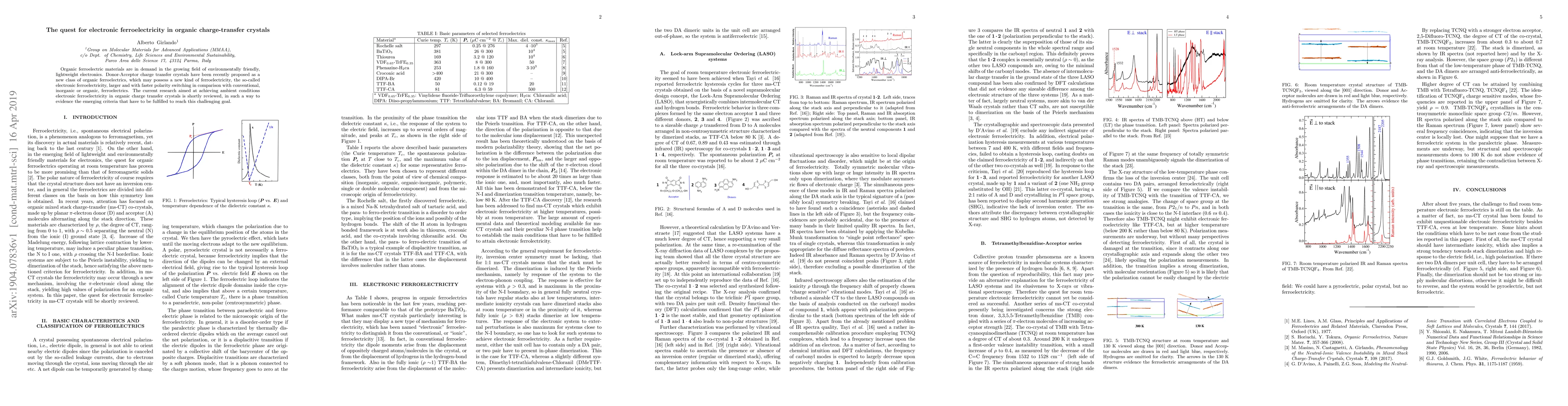 This paper reviews the pursuit of electronic ferroelectricity in organic charge-transfer crystals, highlighting their potential for lightweight, environmentally friendly electronics. It discusses the criteria necessary for achieving ferroelectricity under ambient conditions in these donor-acceptor crystals.