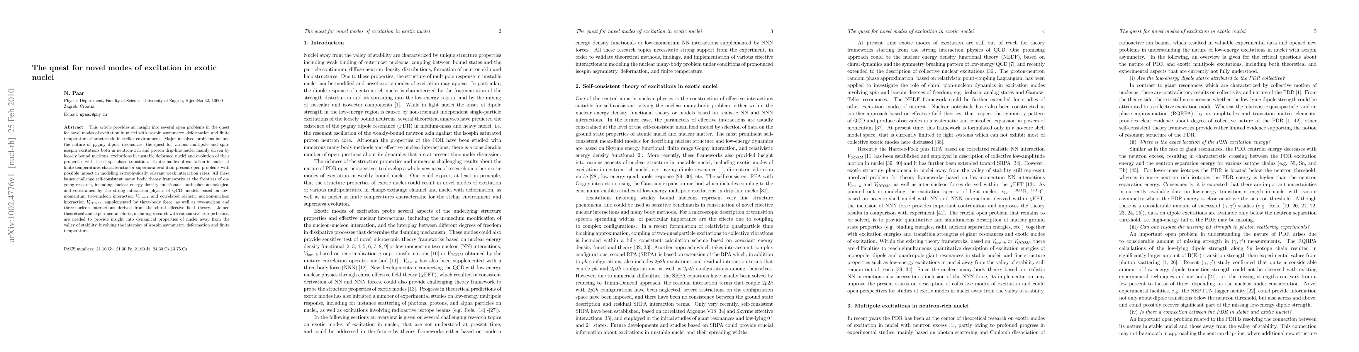This article provides an insight into several open problems in the quest for novel modes of excitation in nuclei with isospin asymmetry, deformation and finite temperature characteristic in stellar environment. Major unsolved problems include the nature of pygmy dipole resonances, the quest for various multipole and spin-isospin excitations both in neutron-rich and proton drip-line nuclei mainly driven by loosely bound nucleons, excitations in unstable deformed nuclei and evolution of their properties with the shape phase transition. Exotic modes of excitation in nuclei at finite temperatures characteristic for supernova evolution present open problems with possible impact in modeling astrophysically relevant weak interaction rates. All these issues challenge self-consistent many body theory frameworks at the frontiers of on-going research, including nuclear energy density functionals, both phenomenological and constrained by the strong interaction physics of QCD, models based on low-momentum two-nucleon interaction V_{low-k} and correlated realistic nucleon-nucleon interaction V_{UCOM}, supplemented by three-body force, as well as two-nucleon and three-nucleon interactions derived from the chiral effective field theory. Joined theoretical and experimental efforts, including research with radioactive isotope beams, are needed to provide insight into dynamical properties of nuclei away from the valley of stability, involving the interplay of isospin asymmetry, deformation and finite temperature.