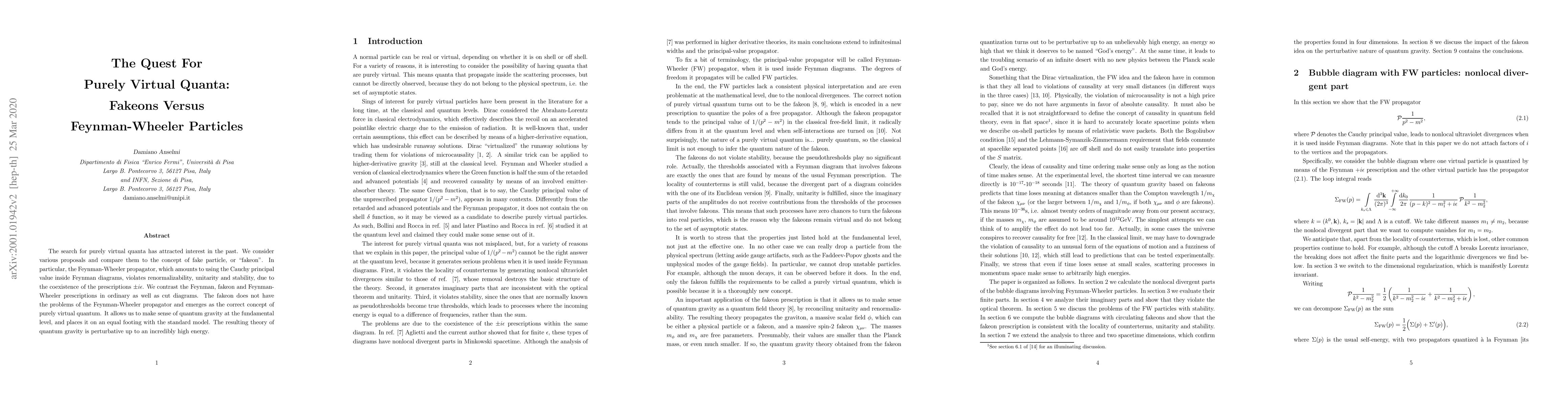 The search for purely virtual quanta has attracted interest in the past. We consider various proposals and compare them to the concept of fake particle, or "fakeon". In particular, the Feynman-Wheeler propagator, which amounts to using the Cauchy principal value inside Feynman diagrams, violates renormalizability, unitarity and stability, due to the coexistence of the prescriptions $\pm i\epsilon $. We contrast the Feynman, fakeon and Feynman-Wheeler prescriptions in ordinary as well as cut diagrams. The fakeon does not have the problems of the Feynman-Wheeler propagator and emerges as the correct concept of purely virtual quantum. It allows us to make sense of quantum gravity at the fundamental level, and places it on an equal footing with the standard model. The resulting theory of quantum gravity is perturbative up to an incredibly high energy.