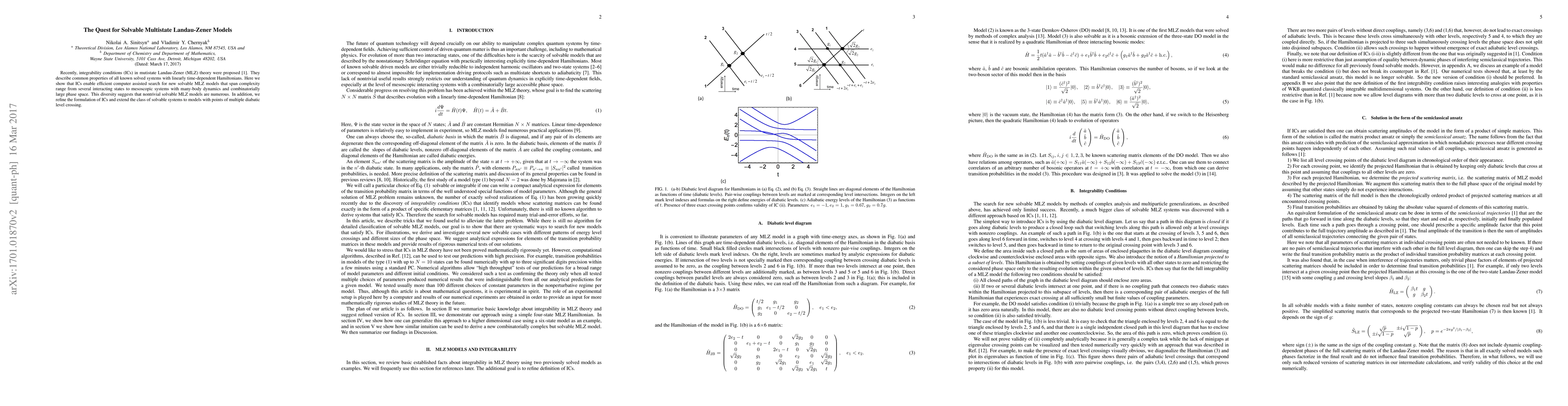 This paper proposes integrability conditions (ICs) to identify solvable multistate Landau-Zener models, enabling efficient computer-assisted searches for new models across various complexities. The study refines IC formulations and extends solvable systems to include those with multiple diabatic level crossings.