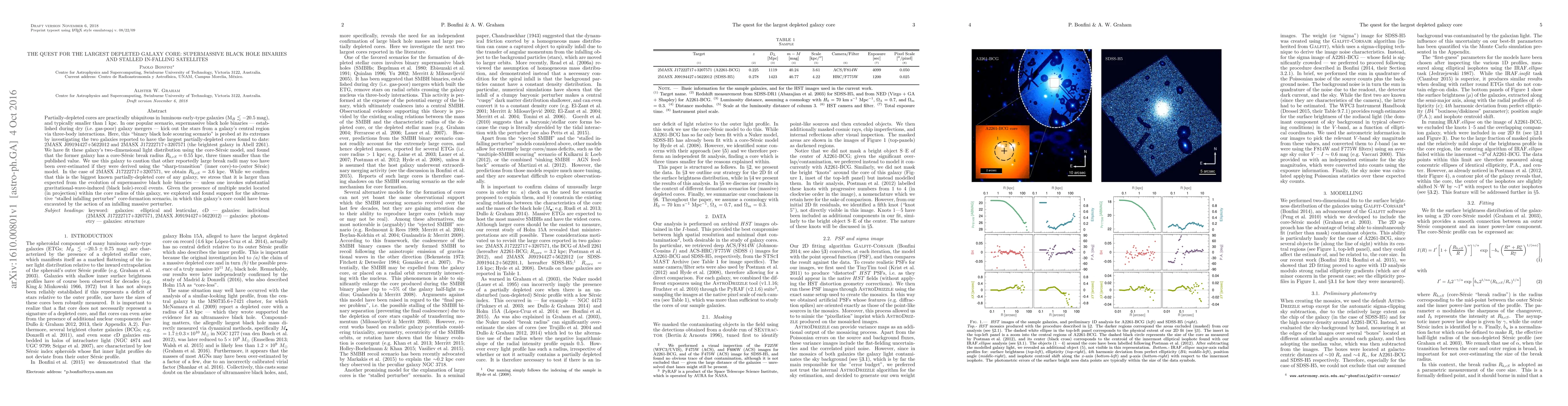 Partially-depleted cores are practically ubiquitous in luminous early-type galaxies (M$_{B}\lesssim-$20.5 mag), and typically smaller than 1 kpc. In one popular scenario, supermassive black hole binaries --- established during dry (i.e. gas-poor) galaxy mergers --- kick out the stars from a galaxy's central region via three-body interactions. Here, this "binary black hole scouring scenario" is probed at its extremes by investigating the two galaxies reported to have the largest partially-depleted cores found to date: 2MASX~J09194427+5622012 and 2MASX~J17222717+3207571 (the brightest galaxy in Abell~2261). We have fit these galaxy's two-dimensional light distribution using the core-S\'{e}rsic model, and found that the former galaxy has a core-S\'{e}rsic break radius $R_{b,cS}=0.55$~kpc, three times smaller than the published value. We use this galaxy to caution that other reportedly large break radii may too have been over-estimated if they were derived using the "sharp-transition" (inner core)-to-(outer S\'{e}rsic) model. In the case of 2MASX~J17222717+3207571, we obtain $R_{b,cS}=3.6$~kpc. While we confirm that this is the biggest known partially-depleted core of any galaxy, we stress that it is larger than expected from the evolution of supermassive black hole binaries --- unless one invokes substantial gravitational-wave-induced (black hole)-recoil events. Given the presence of multiple nuclei located (in projection) within the core radius of this galaxy, we explored and found support for the alternative "stalled infalling perturber" core-formation scenario, in which this galaxy's core could have been excavated by the action of an infalling massive perturber.