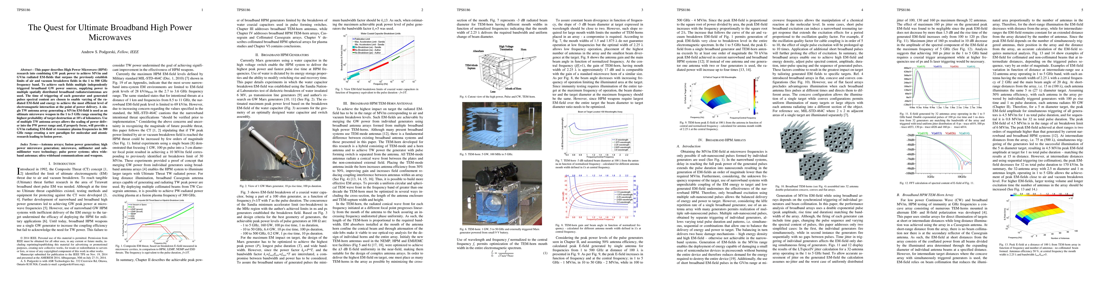 Paper describes High Power Microwave research of combining GW peak power to achieve MV/m and GV/m radiated fields in 1 to 500 GHz band. To achieve such fields multiple independently triggered broadband GW sources, supplying power to multiple spatially distributed broadband radiators/antennas are used. Single TW array is used as an ultimate microwave weapon in 1 to 5 GHz range while multiple TW arrays provide GV/m radiating field at plasma frequencies in 300 GHz range leading to fusion power.