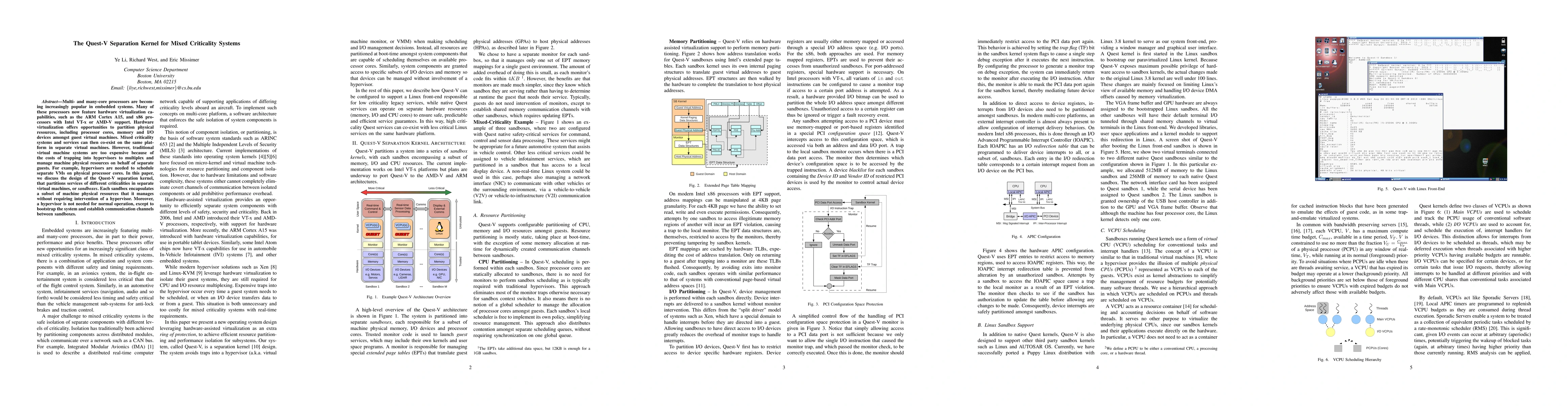This paper introduces the Quest-V separation kernel designed to efficiently manage mixed criticality systems on multi-core processors by partitioning services into separate virtual machines, or sandboxes, each managing its own resources without hypervisor intervention, reducing overhead and costs. Hypervisors are only required for system initialization and inter-sandbox communication.