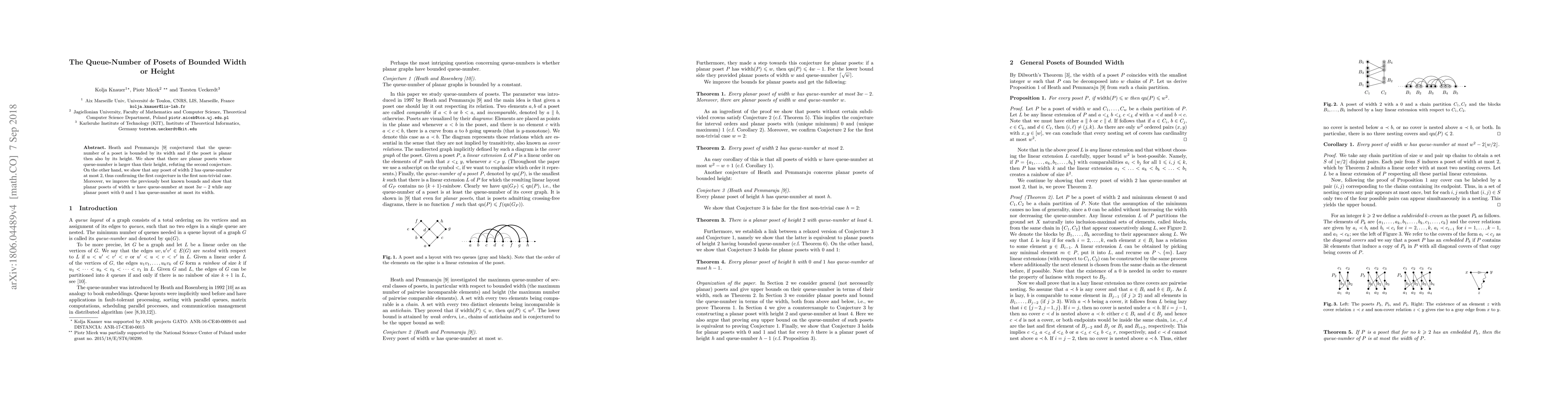 Heath and Pemmaraju conjectured that the queue-number of a poset is bounded by its width and if the poset is planar then also by its height. We show that there are planar posets whose queue-number is larger than their height, refuting the second conjecture. On the other hand, we show that any poset of width $2$ has queue-number at most $2$, thus confirming the first conjecture in the first non-trivial case. Moreover, we improve the previously best known bounds and show that planar posets of width $w$ have queue-number at most $3w-2$ while any planar poset with $0$ and $1$ has queue-number at most its width.