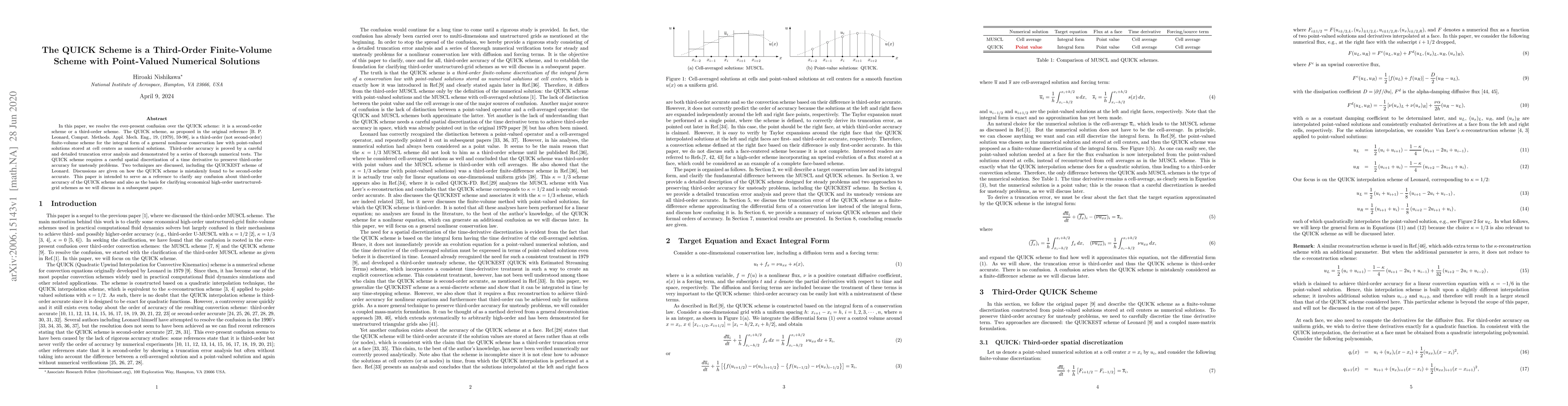 In this paper, we resolve the ever-present confusion over the QUICK scheme: it is a second-order scheme or a third-order scheme. The QUICK scheme, as proposed in the original reference [B. P. Leonard, Comput. Methods. Appl. Mech. Eng., 19, (1979), 59-98], is a third-order (not second-order) finite-volume scheme for the integral form of a general nonlinear conservation law with point-valued solutions stored at cell centers as numerical solutions. Third-order accuracy is proved by a careful and detailed truncation error analysis and demonstrated by a series of thorough numerical tests. The QUICK scheme requires a careful spatial discretization of a time derivative to preserve third-order accuracy for unsteady problems. Two techniques are discussed, including the QUICKEST scheme of Leonard. Discussions are given on how the QUICK scheme is mistakenly found to be second-order accurate. This paper is intended to serve as a reference to clarify any confusion about third-order accuracy of the QUICK scheme and also as the basis for clarifying third-order unstructured-grid schemes as we will discuss in a subsequent paper.