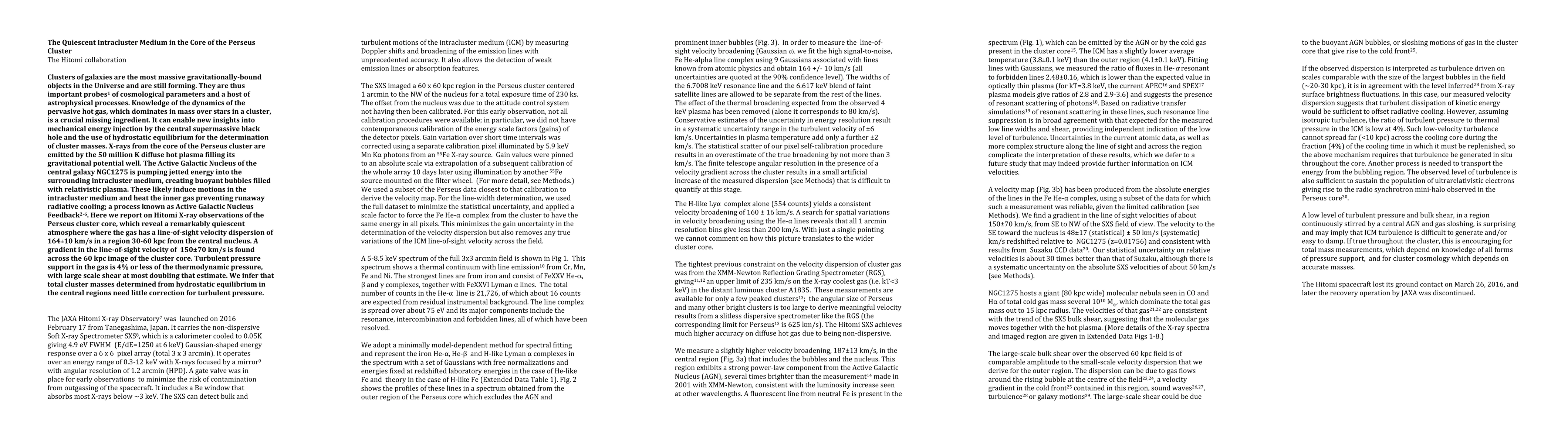 This study utilizes Hitomi X-ray observations to analyze the quiescent intracluster medium in the Perseus Cluster core, revealing a low-velocity dispersion and minimal turbulence. The findings suggest that hydrostatic equilibrium can accurately determine cluster masses without significant corrections for turbulent pressure.