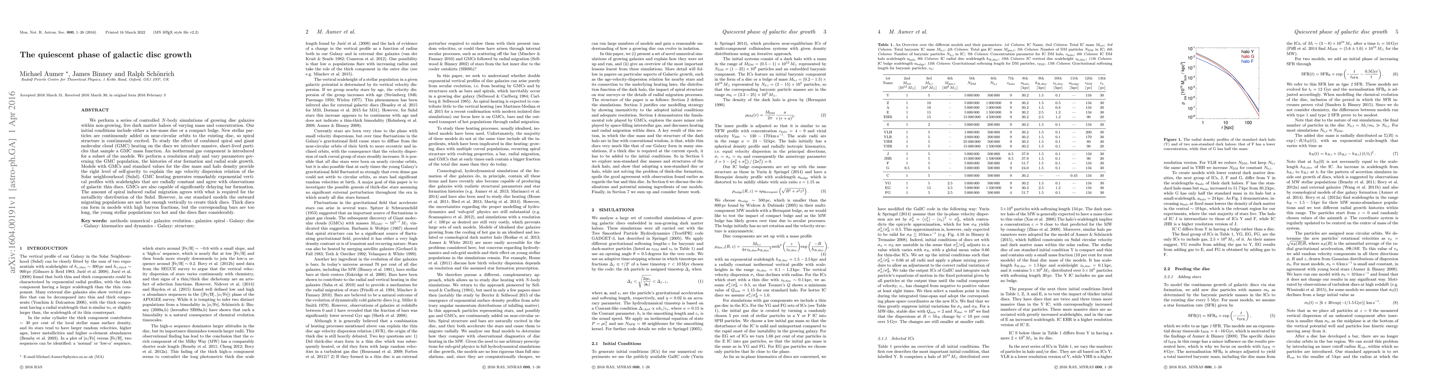 We perform a series of controlled N-body simulations of growing disc galaxies within non-growing, live dark matter haloes of varying mass and concentration. Our initial conditions include either a low-mass disc or a compact bulge. New stellar particles are continuously added on near-circular orbits to the existing disc, so spiral structure is continuously excited. To study the effect of combined spiral and giant molecular cloud (GMC) heating on the discs we introduce massive, short-lived particles that sample a GMC mass function. An isothermal gas component is introduced for a subset of the models. We perform a resolution study and vary parameters governing the GMC population, the histories of star formation and radial scale growth. Models with GMCs and standard values for the disc mass and halo density provide the right level of self-gravity to explain the age velocity dispersion relation of the Solar neighbourhood (Snhd). GMC heating generates remarkably exponential vertical profiles with scaleheights that are radially constant and agree with observations of galactic thin discs. GMCs are also capable of significantly delaying bar formation. The amount of spiral induced radial migration agrees with what is required for the metallicity distribution of the Snhd. However, in our standard models the outward migrating populations are not hot enough vertically to create thick discs. Thick discs can form in models with high baryon fractions, but the corresponding bars are too long, the young stellar populations too hot and the discs flare considerably.