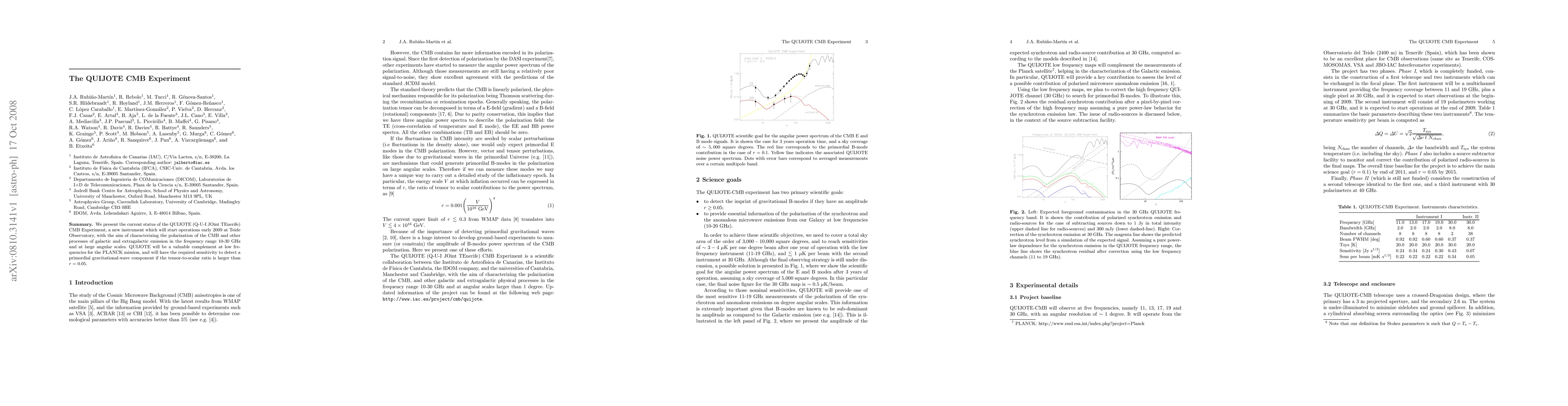 The QUIJOTE experiment aims to study cosmic microwave background polarization at low frequencies, complementing the PLANCK mission and potentially detecting primordial gravitational waves.