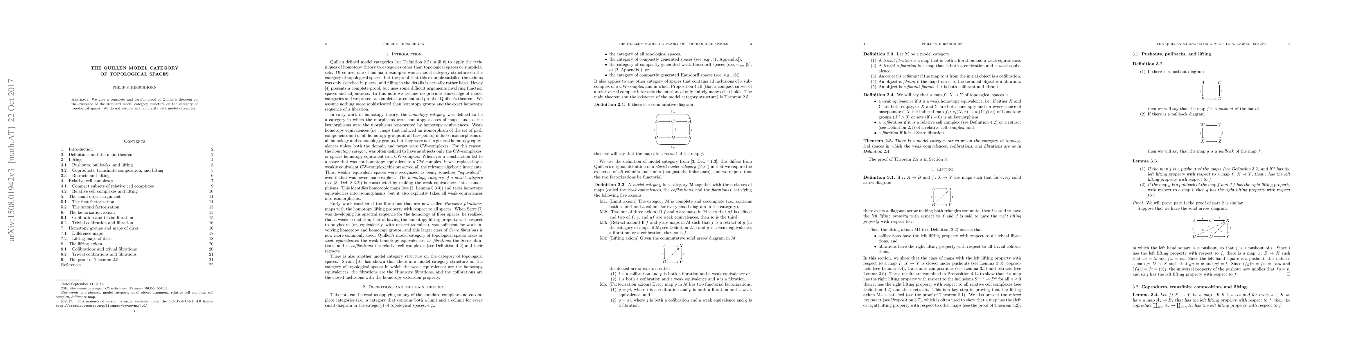This paper proves Quillen's theorem on topological spaces, establishing a model category structure without assuming prior knowledge, and provides a complete proof for the existence of this structure.