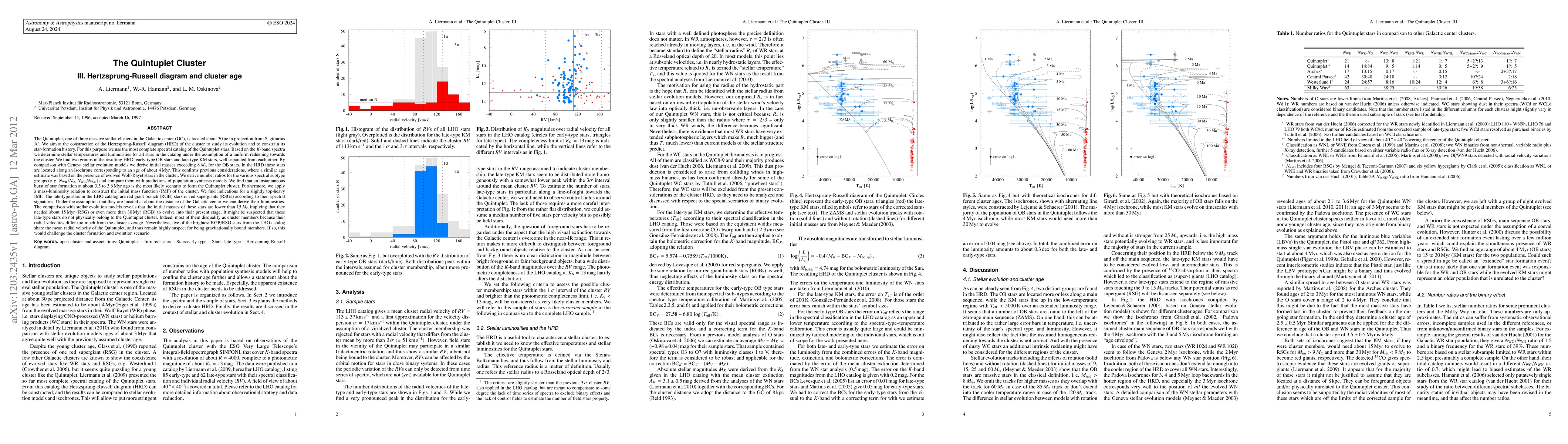 The Quintuplet Cluster's stars have been analyzed, revealing two distinct groups with initial masses over 8 solar masses and a cluster age of around 4 million years, suggesting an instantaneous burst of star formation.