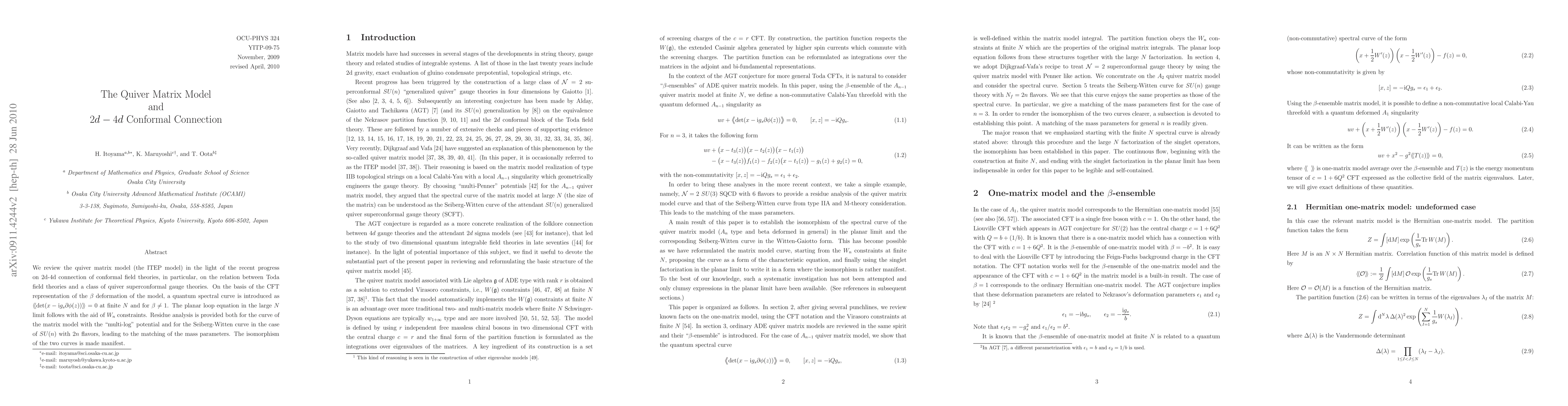 We review the quiver matrix model (the ITEP model) in the light of the recent progress on 2d-4d connection of conformal field theories, in particular, on the relation between Toda field theories and a class of quiver superconformal gauge theories. On the basis of the CFT representation of the beta deformation of the model, a quantum spectral curve is introduced as << det (x- i g_s \partial \phi(z)) >>=0 at finite N and for beta \neq 1. The planar loop equation in the large N limit follows with the aid of W_n constraints. Residue analysis is provided both for the curve of the matrix model with the "multi-log" potential and for the Seiberg-Witten curve in the case of SU(n) with 2n flavors, leading to the matching of the mass parameters. The isomorphism of the two curves is made manifest.