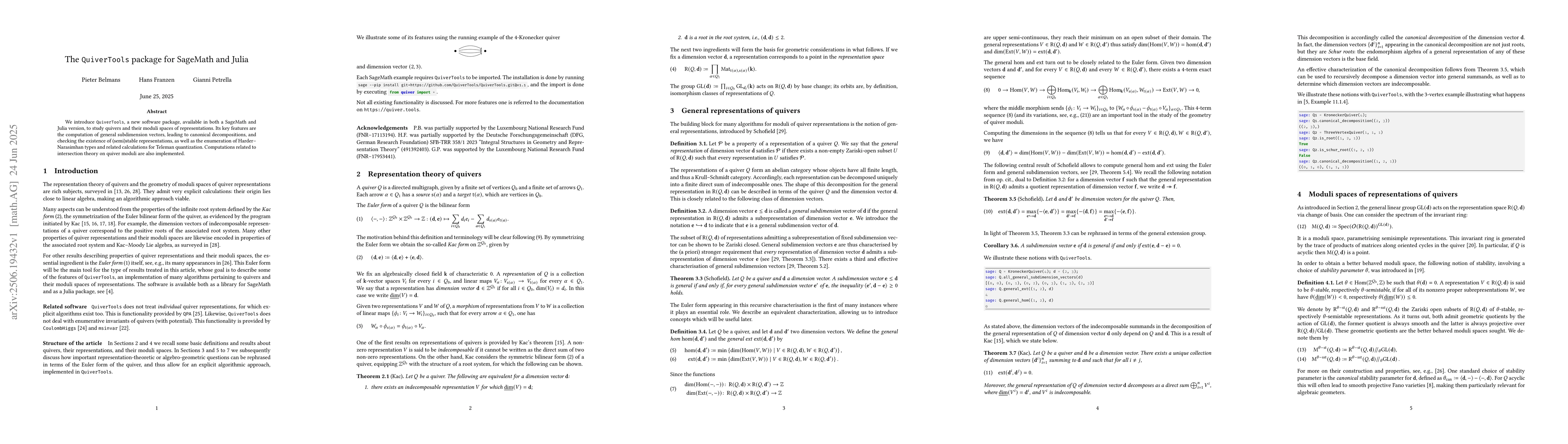 The research introduces QuiverTools, a software package available in both SageMath and Julia versions, designed for studying quivers and their moduli spaces of representations. It computes general subdimension vectors leading to canonical decompositions, checks for (semi)stable representations, enumerates Harder-Narasimhan types, and performs related calculations for Teleman quantization.