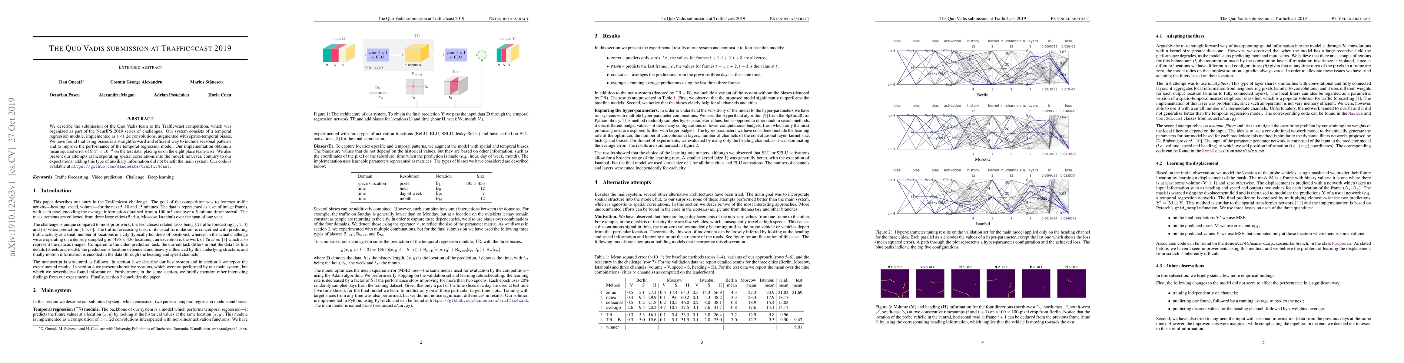 The Quo Vadis team submitted a temporal regression model with $1\times1$ 2D convolutions and spatio-temporal biases for the Traffic4cast 2019 competition, achieving a mean squared error of $9.47\times 10^{-3}$ and placing eighth. Despite attempts to incorporate spatial correlations, they found no benefit to the main model.
