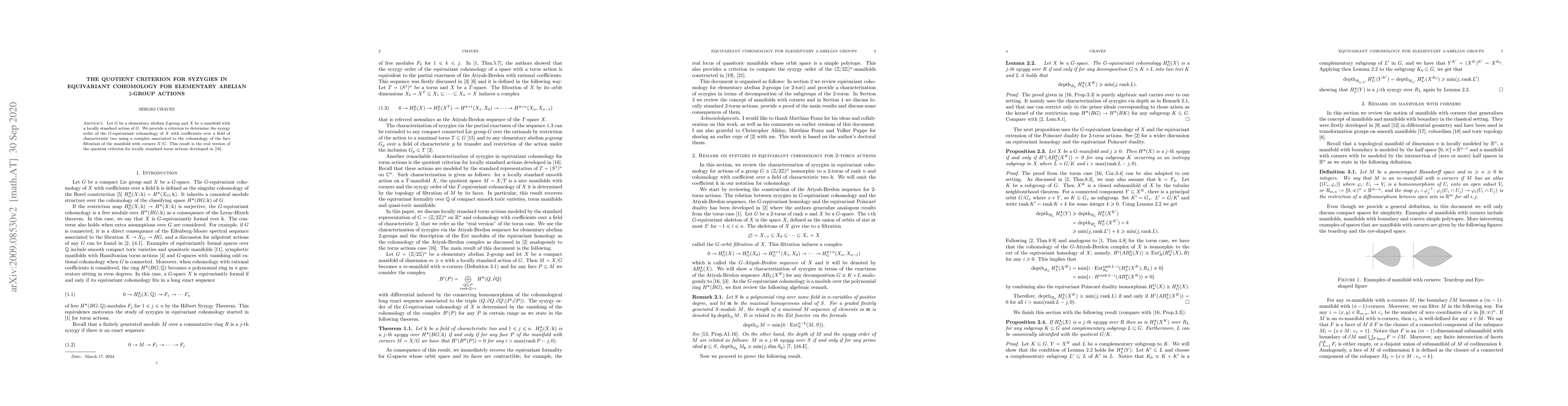 This paper establishes a criterion for determining the syzygy order of the $G$-equivariant cohomology of a manifold $X$ with an elementary abelian $2$-group action, using a complex linked to the face filtration of $X/G$. This extends the quotient criterion for torus actions previously developed by M. Franz.