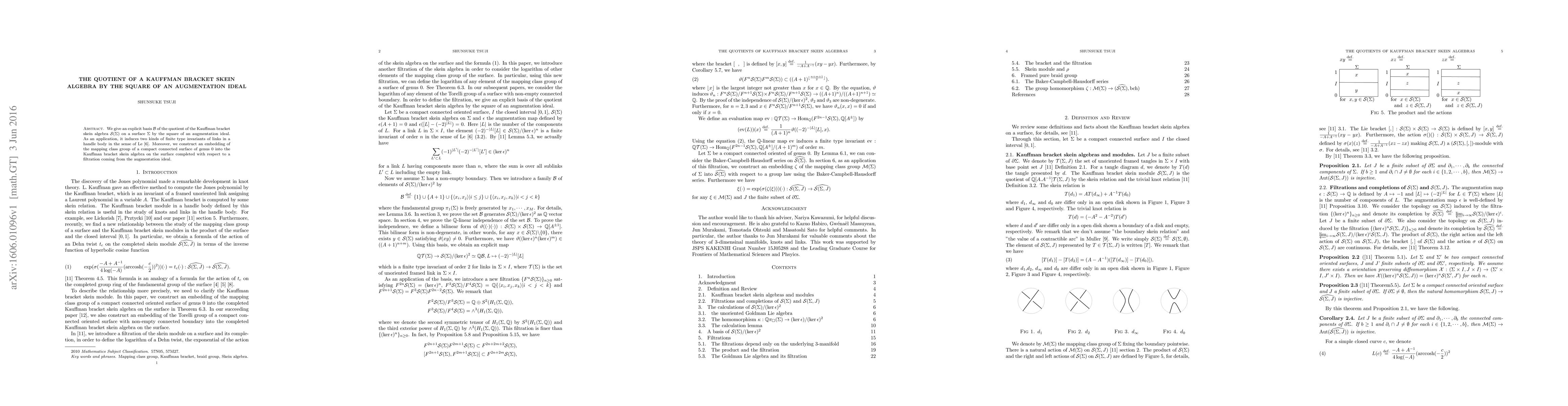 We give an explicit basis $\mathcal{B}$ of the quotient of the Kauffman bracket skein algebra $\mathcal{S} (\Sigma)$ on a surface $\Sigma$ by the square of an augmentation ideal. As an application, it induces two kinds of finite type invariants of links in a handle body in the sense of Le. Moreover, we construct an embedding of the mapping class group of a compact connected surface of genus $0$ into the Kauffman bracket skein algebra on the surface completed with respect to a filtration coming from the augmentation ideal.