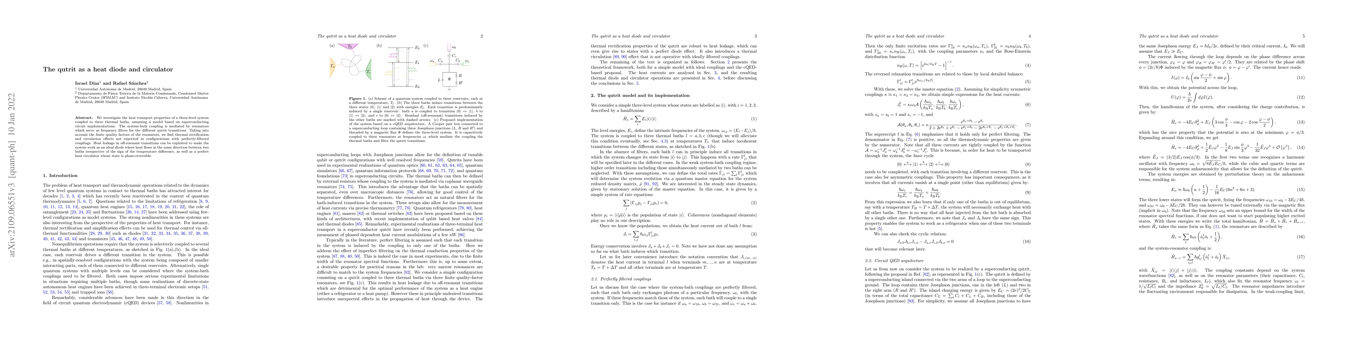 This paper explores a three-level superconducting system coupled to three thermal baths, demonstrating thermal rectification and circulation due to finite resonator quality factors. The system functions as an ideal heat diode and a perfect heat circulator by exploiting heat leakage in off-resonant transitions.