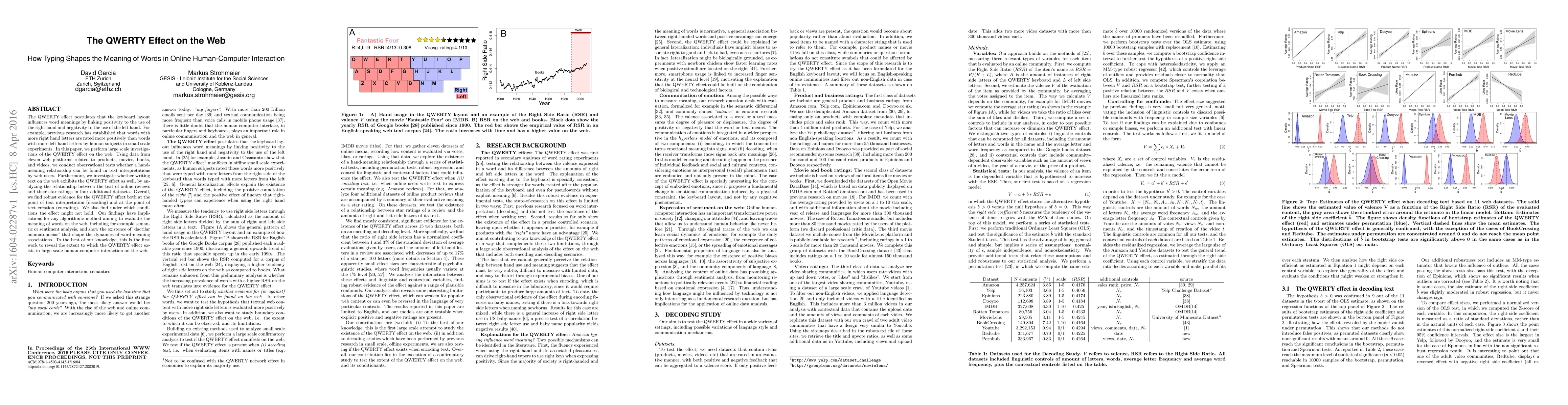 The QWERTY effect postulates that the keyboard layout influences word meanings by linking positivity to the use of the right hand and negativity to the use of the left hand. For example, previous research has established that words with more right hand letters are rated more positively than words with more left hand letters by human subjects in small scale experiments. In this paper, we perform large scale investigations of the QWERTY effect on the web. Using data from eleven web platforms related to products, movies, books, and videos, we conduct observational tests whether a hand-meaning relationship can be found in decoding text on the web. Furthermore, we investigate whether encoding text on the web exhibits the QWERTY effect as well, by analyzing the relationship between the text of online reviews and their star ratings in four additional datasets. Overall, we find robust evidence for the QWERTY effect both at the point of text interpretation (decoding) and at the point of text creation (encoding). We also find under which conditions the effect might not hold. Our findings have implications for any algorithmic method aiming to evaluate the meaning of words on the web, including for example semantic or sentiment analysis, and show the existence of "dactilar onomatopoeias" that shape the dynamics of word-meaning associations. To the best of our knowledge, this is the first work to reveal the extent to which the QWERTY effect exists in large scale human-computer interaction on the web.