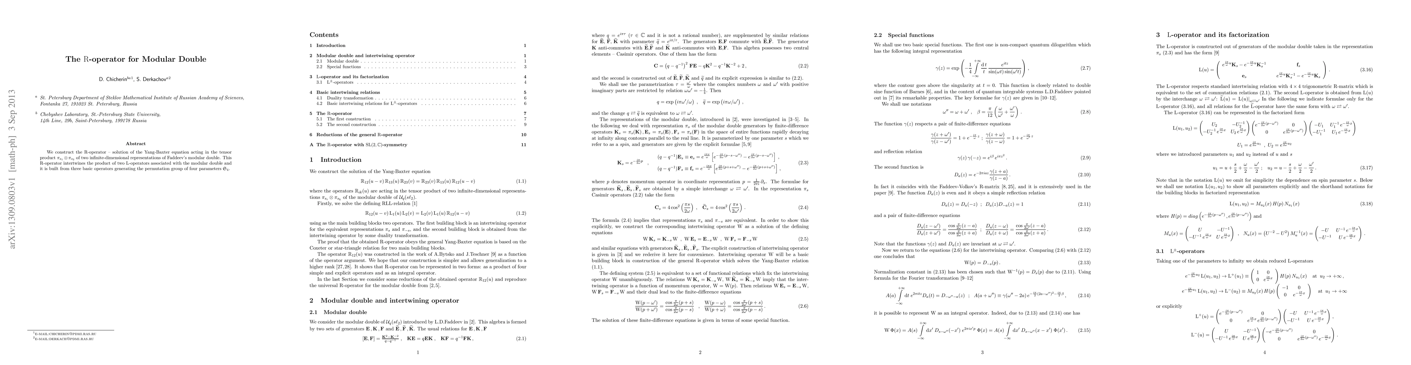 The paper constructs an R-operator that satisfies the Yang-Baxter equation and operates within the tensor product of two infinite-dimensional representations of Faddeev's modular double, utilizing three basic operators from the permutation group S_4 to intertwine associated L-operators.
