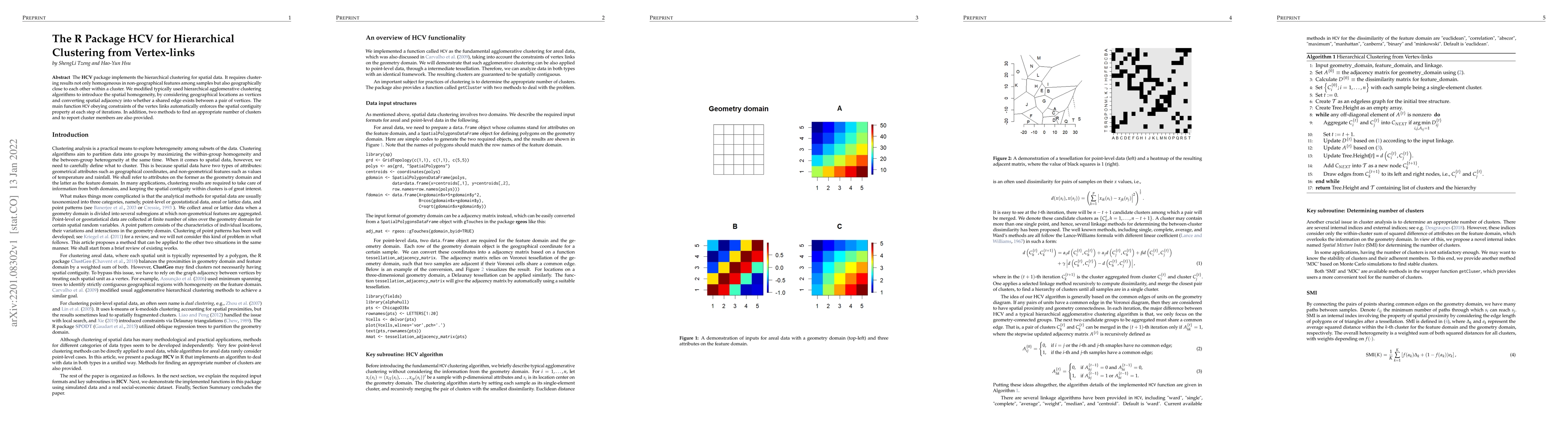 The HCV package implements the hierarchical clustering for spatial data. It requires clustering results not only homogeneous in non-geographical features among samples but also geographically close to each other within a cluster. We modified typically used hierarchical agglomerative clustering algorithms to introduce the spatial homogeneity, by considering geographical locations as vertices and converting spatial adjacency into whether a shared edge exists between a pair of vertices. The main function HCV obeying constraints of the vertex links automatically enforces the spatial contiguity property at each step of iterations. In addition, two methods to find an appropriate number of clusters and to report cluster members are also provided.