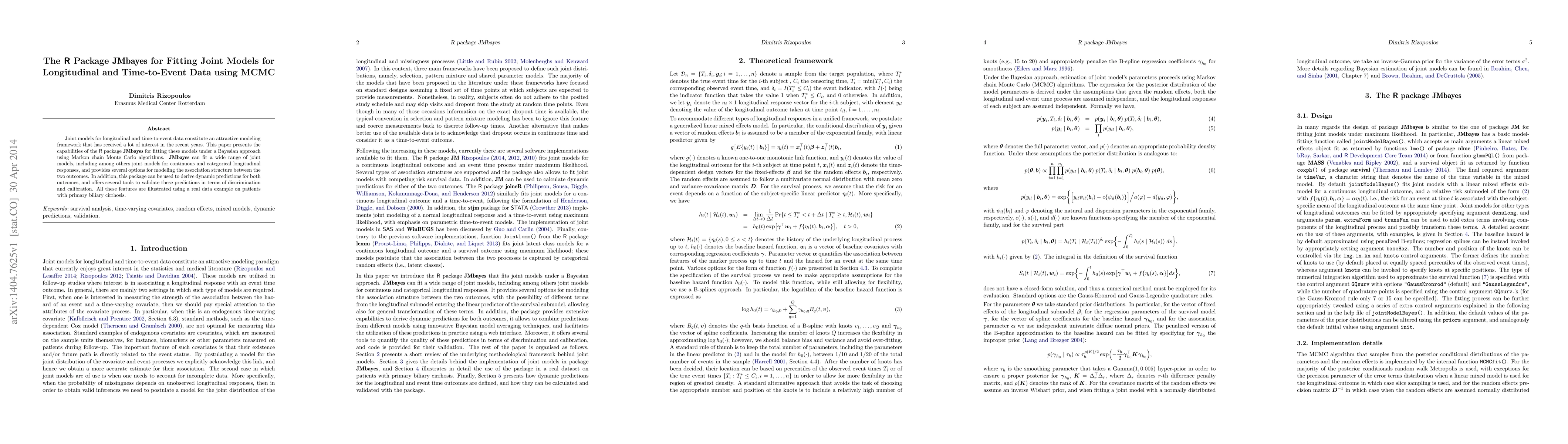 The R package JMbayes fits joint models for longitudinal and time-to-event data using Bayesian MCMC methods, accommodating various longitudinal responses and association structures, and providing tools for dynamic prediction and validation. Demonstrated with a dataset on patients with primary biliary cirrhosis.