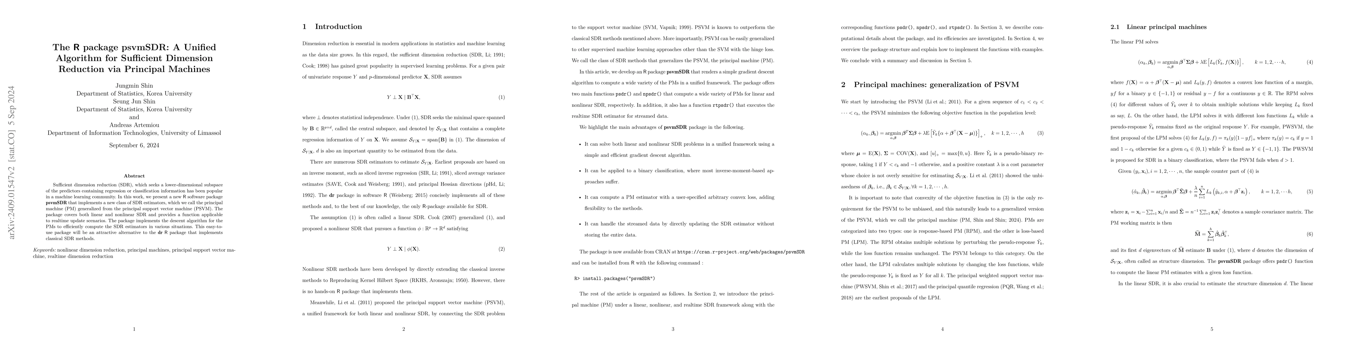 The paper introduces the R package psvmSDR, implementing a unified algorithm for Sufficient Dimension Reduction (SDR) via Principal Machines (PMs), covering both linear and nonlinear SDR. It employs a gradient descent method for efficient computation.