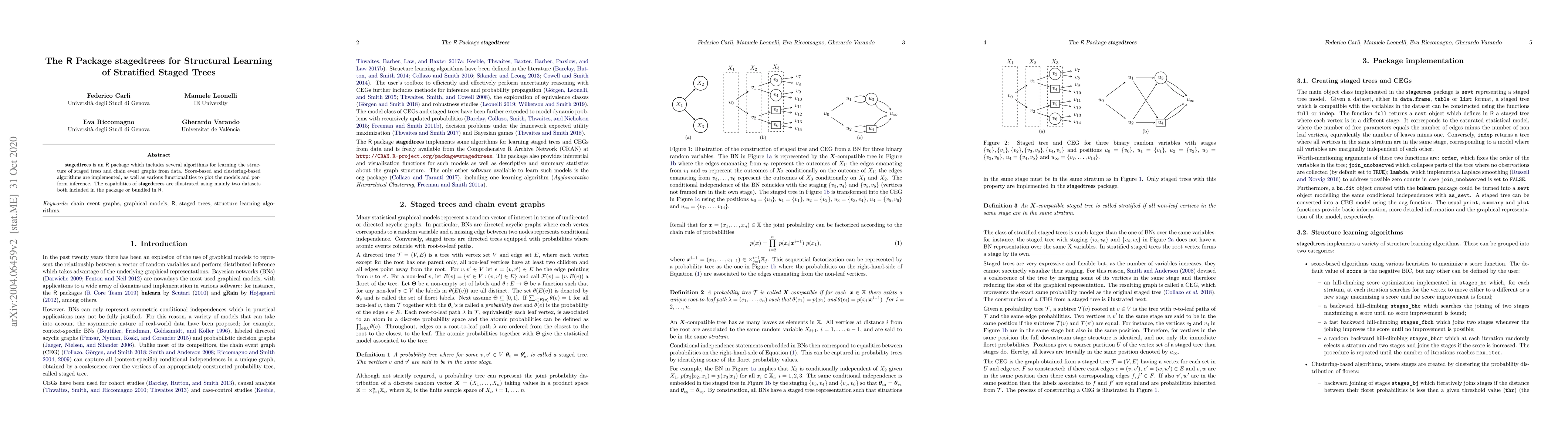 Summary: The R package stagedtrees offers algorithms for learning the structure of stratified staged trees and chain event graphs, with score-based and clustering-based methods, and includes functionalities for plotting and inference. It is demonstrated using two bundled datasets.
