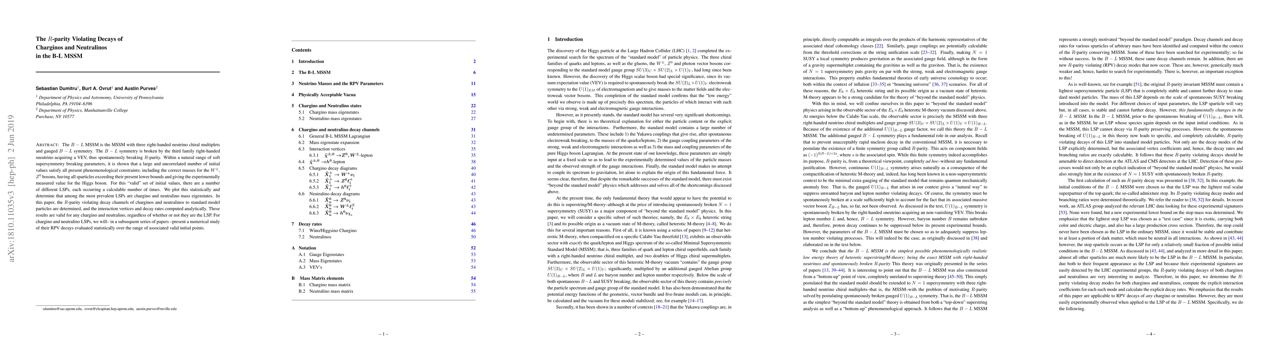 The $B-L$ MSSM is the MSSM with three right-handed neutrino chiral multiplets and gauged $B-L$ symmetry. The $B-L$ symmetry is broken by the third family right-handed sneutrino acquiring a VEV, thus spontaneously breaking $R$-parity. Within a natural range of soft supersymmetry breaking parameters, it is shown that a large and uncorrelated number of initial values satisfy all present phenomenological constraints; including the correct masses for the $W^{\pm}$, $Z^0$ bosons, having all sparticles exceeding their present lower bounds and giving the experimentally measured value for the Higgs boson. For this "valid" set of initial values, there are a number of different LSPs, each occurring a calculable number of times. We plot this statistically and determine that among the most prevalent LSPs are chargino and neutralino mass eigenstates. In this paper, the $R$-parity violating decay channels of charginos and neutralinos to standard model particles are determined, and the interaction vertices and decay rates computed analytically. These results are valid for any chargino and neutralino, regardless of whether or not they are the LSP. For chargino and neutralino LSPs, we will-- in a subsequent series of papers --present a numerical study of their RPV decays evaluated statistically over the range of associated valid initial points.