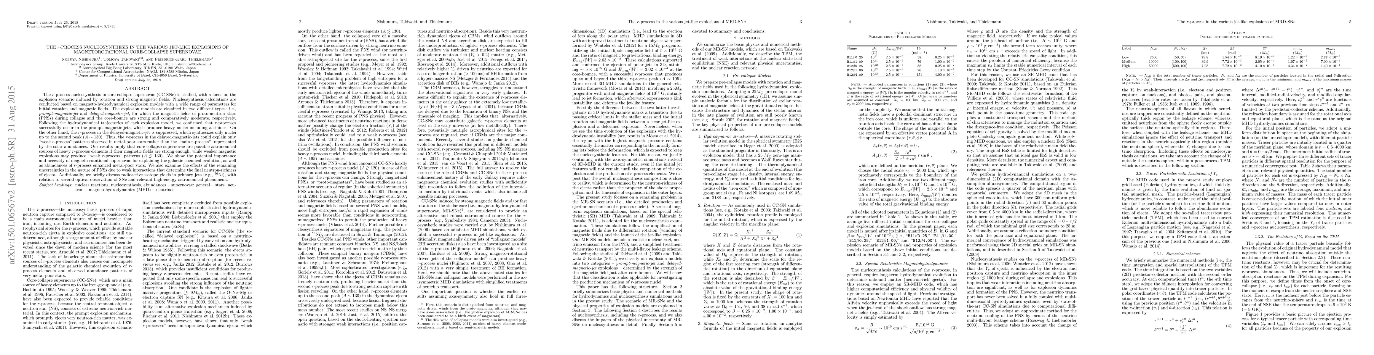 This paper explores r-process nucleosynthesis in magnetorotational core-collapse supernovae, finding that prompt-magnetic-jets produce heavy nuclei including actinides, while delayed-magnetic-jets synthesize only lighter nuclei up to $A \sim 130$, explaining "weak r-process" patterns. It highlights the role of strong magnetic fields in generating heavy r-process elements.