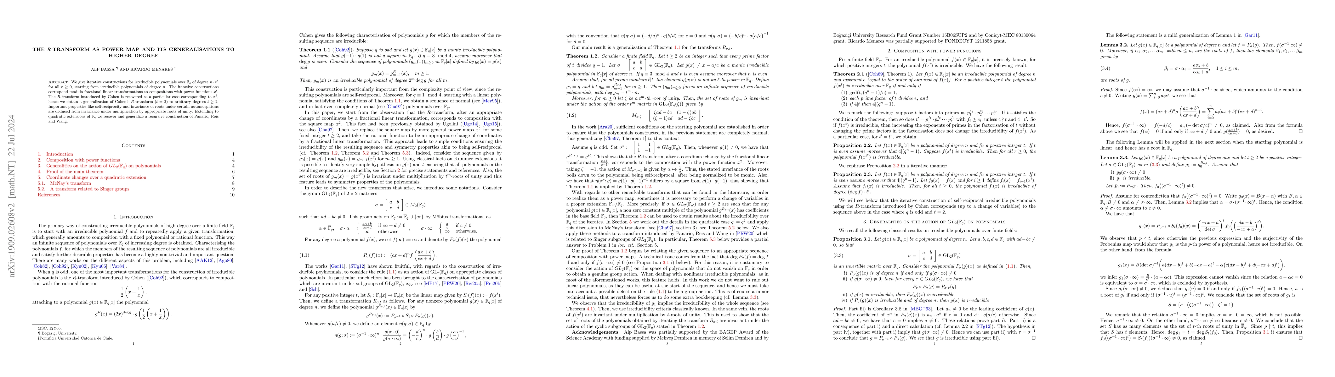 We give iterative constructions for irreducible polynomials over F_q of degree nt^r for all nonnegative integers r, starting from irreducible polynomials of degree n. The iterative constructions correspond modulo fractional linear transformations to compositions with power functions x^t. The R-transform introduced by Cohen is recovered as a particular case corresponding to x^2, hence we obtain a generalization of Cohen's R-transform (t=2) to arbitrary degrees t bigger that two. Important properties like self-reciprocity and invariance of roots under certain automorphisms are deduced from invariance under multiplication by appropriate roots of unity. Extending to quadratic extensions of F_q we recover and generalize a recently obtained recursive construction of Panario, Reis and Wang.