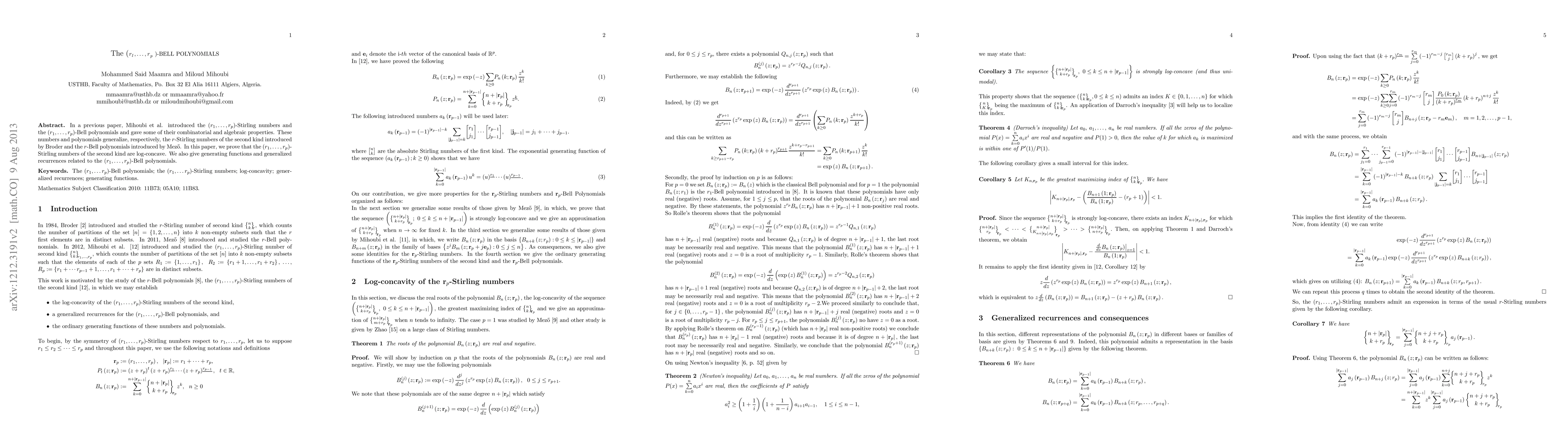 In a previous paper, Mihoubi et al. introduced the $(r_{1},...,r_{p}) $-Stirling numbers and the $(r_{1},...,r_{p}) $-Bell polynomials and gave some of their combinatorial and algebraic properties. These numbers and polynomials generalize, respectively, the $r$-Stirling numbers of the second kind introduced by Broder and the $r$-Bell polynomials introduced by Mez\H{o}. In this paper, we prove that the $(r_{1},...,r_{p}) $-Stirling numbers of the second kind are log-concave. We also give generating functions and generalized recurrences related to the $(r_{1},...,r_{p}) $-Bell polynomials.