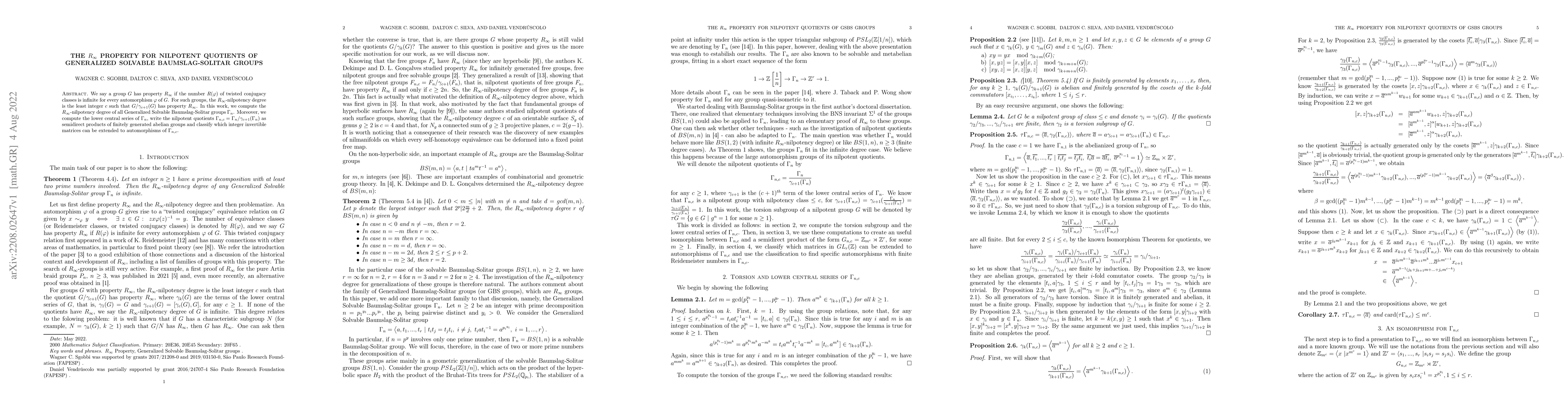 This research computes the $R_\infty$-nilpotency degree for Generalized Solvable Baumslag-Solitar groups $\Gamma_n$ and expresses their nilpotent quotients $\Gamma_{n,c}$ as semidirect products of finitely generated abelian groups. It also classifies invertible integer matrices that extend to automorphisms of these nilpotent quotients.
