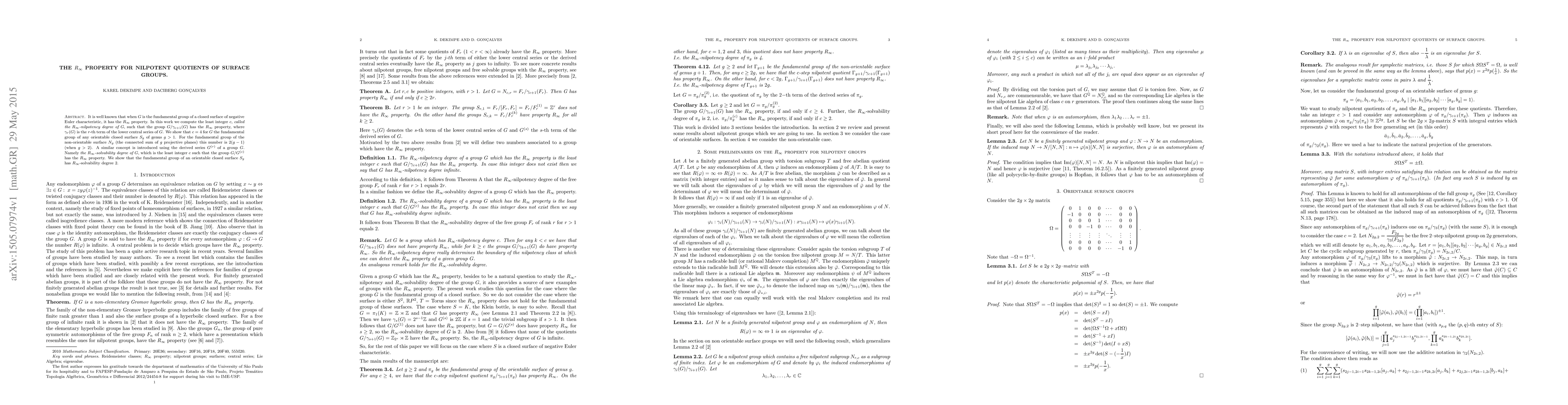 It is well known that when $G$ is the fundamental group of a closed surface of negative Euler characteristic, it has the $R_{\infty}$ property. In this work we compute the least integer $c$, {\it called the $R_{\infty}$-nilpotency degree of $G$}, such that the group $G/ \gamma_{c+1}(G)$ has the $R_{\infty}$ property, where $\gamma_r(G)$ is the $r$-th term of the lower central series of $G$. We show that $c=4$ for $G$ the fundamental group of any orientable closed surface $S_g$ of genus $g>1$. For the fundamental group of the non-orientable surface $N_g$ (the connected sum of $g$ projective planes) this number is $2(g-1)$ (when $g>2$). A similar concept is introduced using the derived series $G^{(r)}$ of a group $G$. Namely {\it the $R_{\infty}$-solvability degree of $G$}, which is the least integer $c$ such that the group $G/G^{(c)}$ has the $R_{\infty}$ property. We show that the fundamental group of an orientable closed surface $S_g$ has $R_{\infty}$-solvability degree $2$.