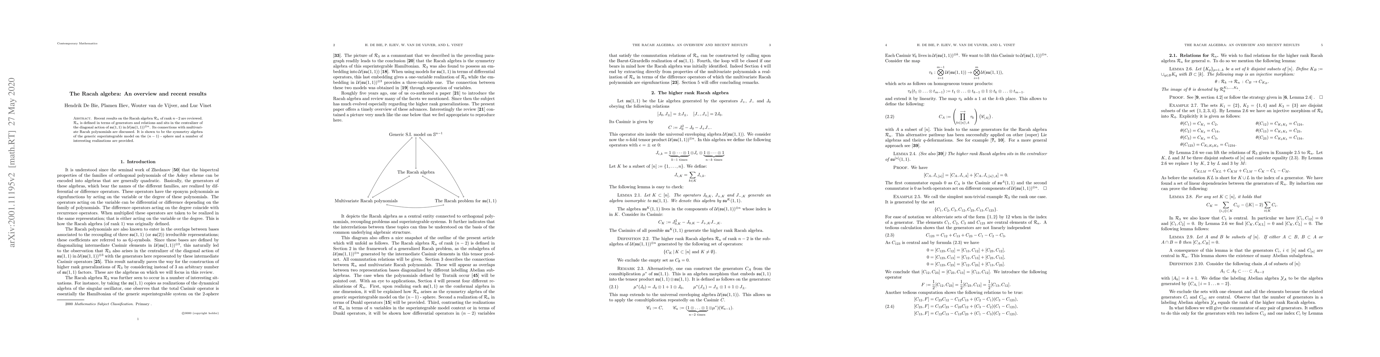 The paper provides an overview of the Racah algebra $mathcal{R}_n$, detailing its generators, relations, and its role as the symmetry algebra for a superintegrable model on the (n-1)-sphere. It also explores $mathcal{R}_n$'s connections with multivariate Racah polynomials and offers various realizations of the algebra, situating it within the centralizer of $mathfrak{su}(1,1)$'s diagonal action in $mathcal{U}(mathfrak{su}(1,1))^{otimes n}$.