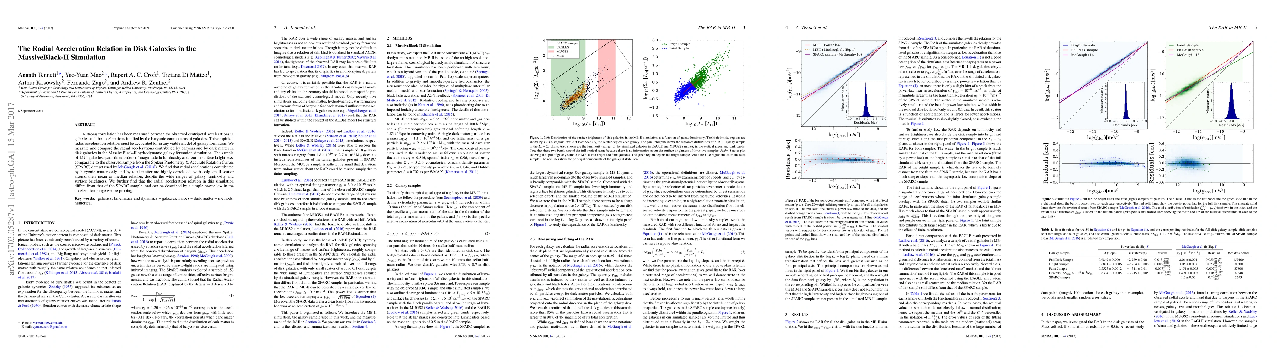 The MassiveBlack-II simulation reveals a strong correlation between observed centripetal accelerations in galaxies and those implied by baryonic components, supporting the radial acceleration relation. However, the simulated relation differs from the observed SPARC sample, suggesting discrepancies in galaxy formation models.