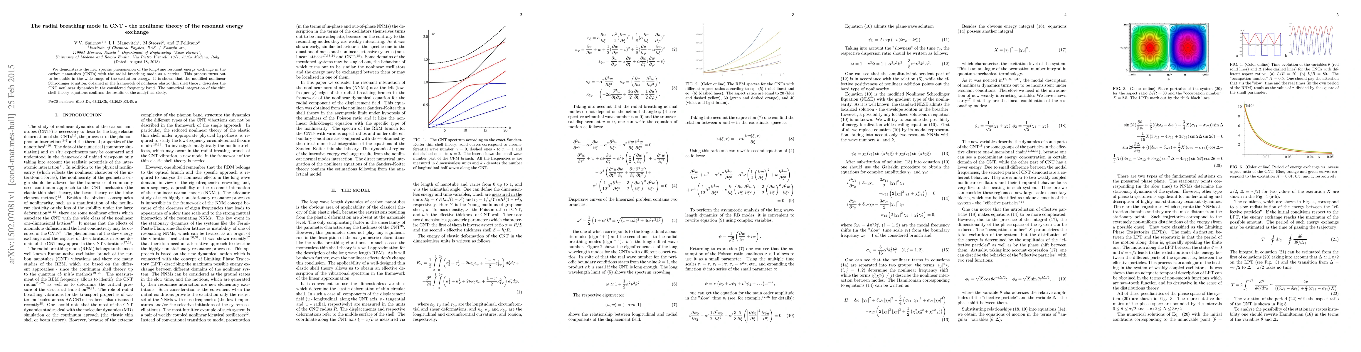 We demonstrate the new specific phenomenon of the long-time resonant energy exchange in the carbon nanotubes (CNTs) with the radial breathing mode as a carrier. This process turns out to be stable in the wide range of the excitation energy. It is shown that the modified nonlinear Schr\"odinger equation, obtained in the framework of nonlinear elastic thin shell theory, describes the CNT nonlinear dynamics in the considered frequency band. The numerical integration of the thin shell theory equations confirms the results of the analytical study.