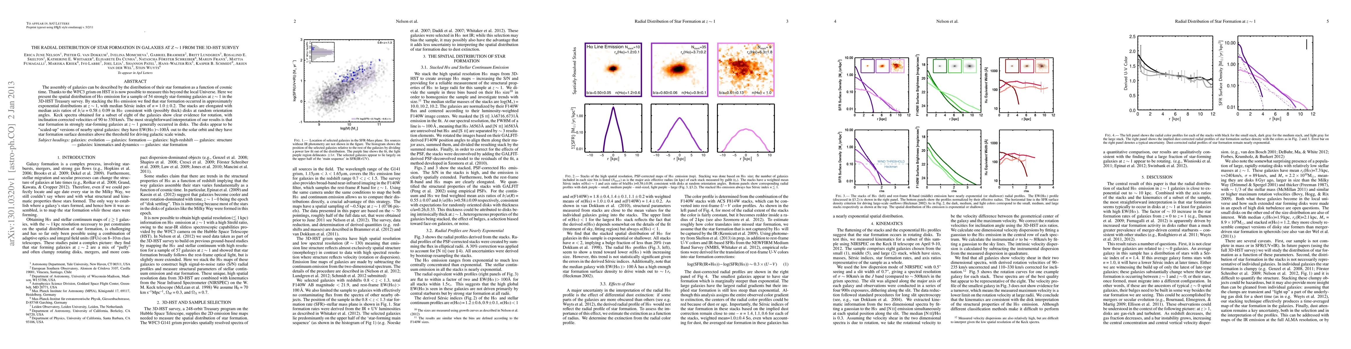 The assembly of galaxies can be described by the distribution of their star formation as a function of cosmic time. Thanks to the WFC3 grism on HST it is now possible to measure this beyond the local Universe. Here we present the spatial distribution of Halpha emission for a sample of 54 strongly star-forming galaxies at z~1 in the 3D-HST Treasury survey. By stacking the Halpha emission we find that star formation occurred in approximately exponential distributions at z~1, with median Sersic index of n=1.0+-0.2. The stacks are elongated with median axis ratios of b/a=0.58+-0.09 in Halpha, consistent with (possibly thick) disks at random orientation angles. Keck spectra obtained for a subset of eight of the galaxies show clear evidence for rotation, with inclination-corrected velocities of 90 to 330 km/s. The most straightforward interpretation of our results is that star formation in strongly star-forming galaxies at z~1 generally occurred in disks. The disks appear to be "scaled-up" versions of nearby spiral galaxies: they have EW(Halpha)~100 Angstroms out to the solar orbit and they have star formation surface densities above the threshold for driving galactic scale winds.