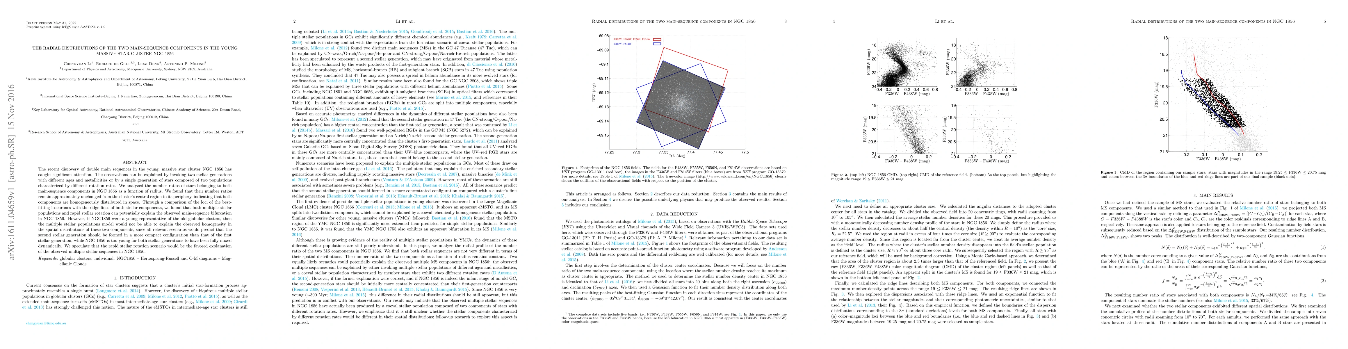 This study investigates the radial distribution of the two main-sequence components in NGC 1856, revealing a homogeneous spatial distribution. The findings suggest that either multiple stellar populations or rapid stellar rotation could explain the observed bifurcation, with rapid rotation being the favored explanation due to the cluster's youth.