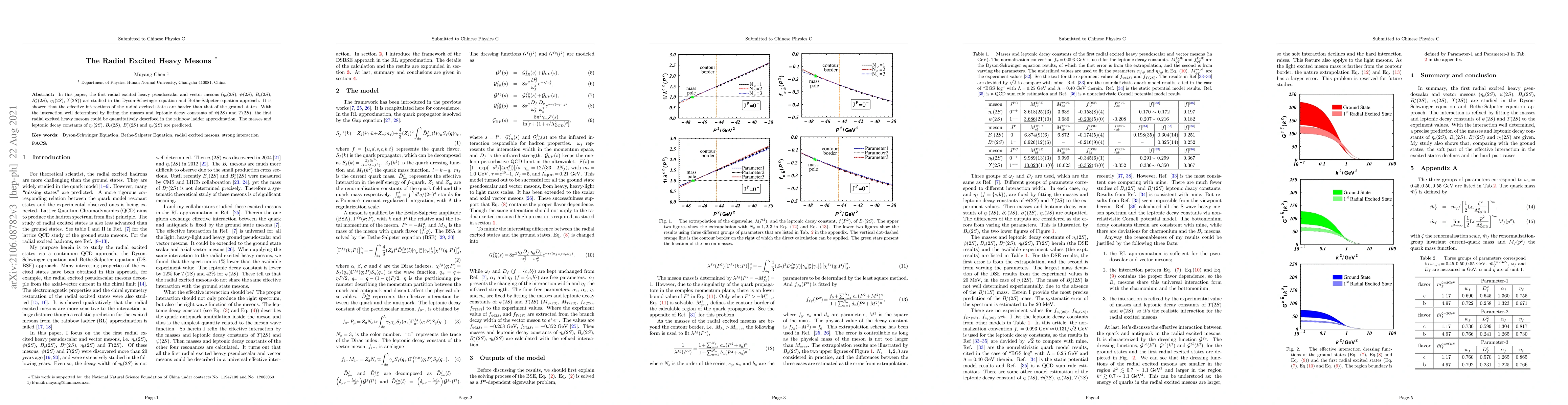 This paper investigates the first radial excited heavy pseudoscalar and vector mesons using the Dyson-Schwinger and Bethe-Salpeter equations, finding stronger effective interactions in excited states compared to ground states. The study predicts the masses and decay constants of $\eta_c(2S)$, $B_c(2S)$, $B^*_c(2S)$, and $\eta_b(2S)$ in the rainbow ladder approximation.