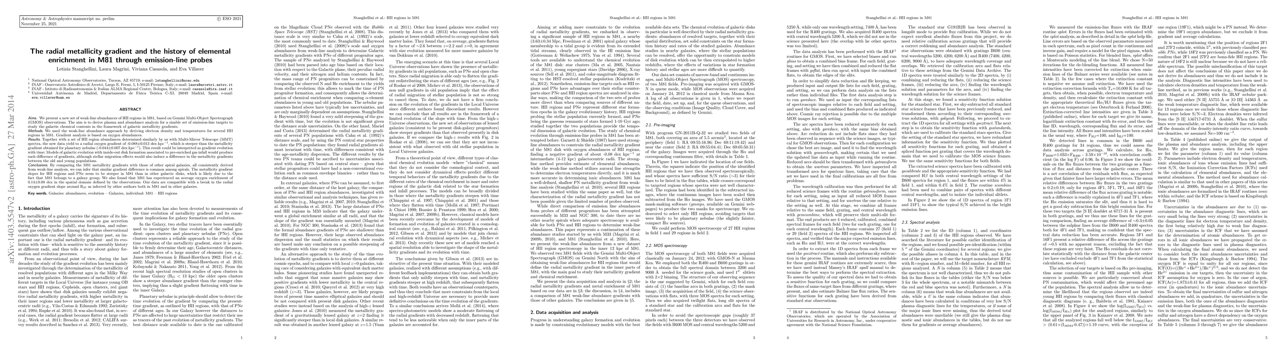 We present a new set of weak-line abundances of HII regions in M81, based on Gemini Multi-Object Spectrograph (GMOS) observations. The aim is to derive plasma and abundance analysis for a sizable set of emission-line targets to study the galactic chemical contents in the framework of galactic metallicity gradients. We used the weak-line abundance approach by deriving electron density and temperatures for several HII regions in M81. Gradient analysis is based on oxygen abundances.Together with a set of HII region abundances determined similarly by us with Multi-Mirror Telescope (MMT) spectra, the new data yield to a radial oxygen gradient of -0.088$\pm$0.013 dex kpc$^{-1}$, which is steeper than the metallicity gradient obtained for planetary nebulae (-0.044$\pm$0.007 dex kpc$^{-1}$). This result could be interpreted as gradient evolution with time: Models of galactic evolution with inside-out disk formation associated to pre-enriched gas infall would produce such difference of gradients, although stellar migration effects would also induce a difference in the metallicity gradients between the old and young populations. By comparing the M81 metallicity gradients with those of other spiral galaxies, all consistently derived from weak-line analysis, we can infer that similar gradient difference is common among spirals. The metallicity gradient slopes for HII regions and PNe seem to be steeper in M81 than in other galactic disks, which is likely due to the fact that M81 belongs to a galaxy group. We also found that M81 has experienced an average oxygen enrichment of 0.14$\pm$0.08 dex in the spatial domain defined by the observations. Our data are compatible with a break in the radial oxygen gradient slope around R$_{25}$ as inferred by other authors both in M81 and in other galaxies.