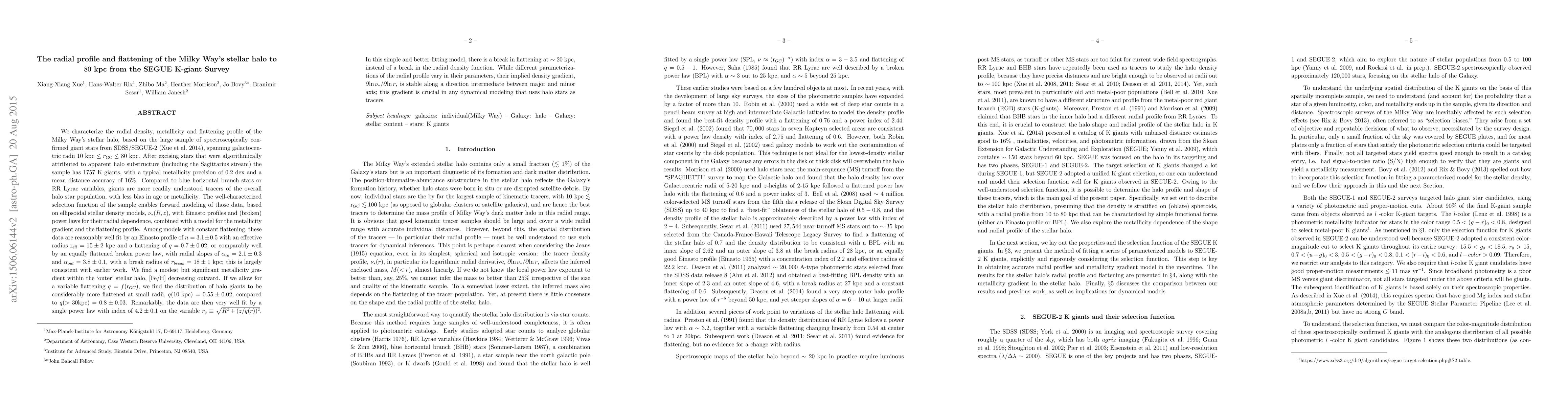 This paper characterizes the radial density, metallicity, and flattening profile of the Milky Way's stellar halo using 1757 K-giant stars from the SDSS/SEGUE-2 survey. The findings suggest a well-fitting Einasto profile with a flattening of 0.7±0.02, and a significant metallicity gradient. Allowing for variable flattening, the stellar halo shows a more flattened distribution at smaller radii.