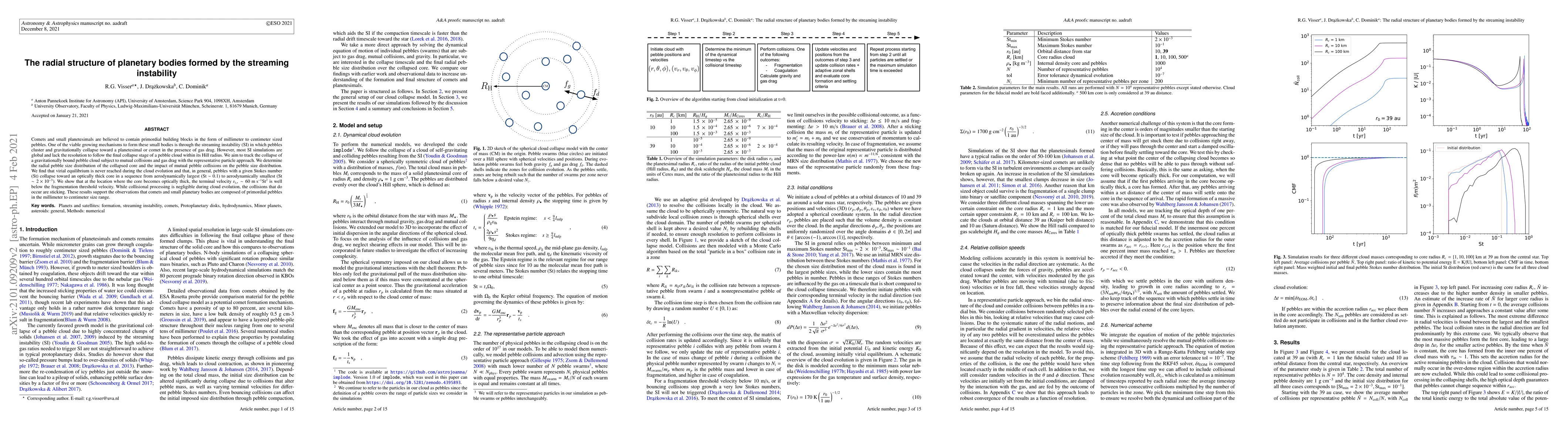 This study investigates the radial structure of planetary bodies formed via the streaming instability, finding that pebbles with varying sizes collapse towards an optically thick core in a sequence from largest to smallest. Collisions are rare but result in sticking, supporting the theory that small bodies are built from primordial millimeter to centimeter-sized pebbles.