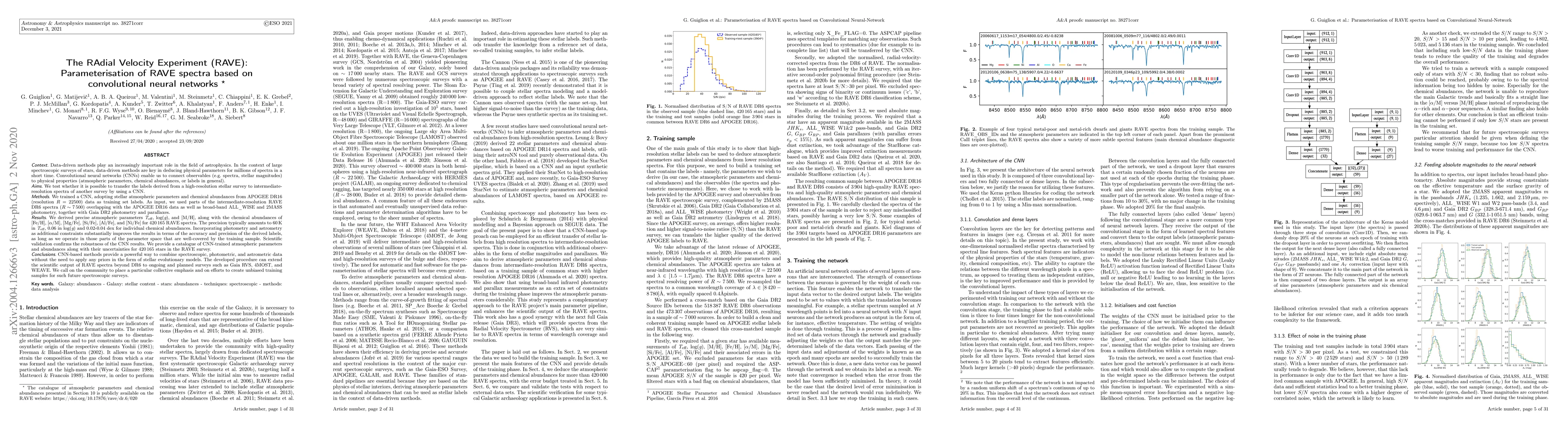 The RAdial Velocity Experiment (RAVE) utilized convolutional neural networks (CNNs) to parameterize RAVE spectra, achieving precise atmospheric parameters and chemical abundances for 420,165 stars. The integration of photometric and astrometric data significantly enhances the accuracy and precision of the derived parameters.
