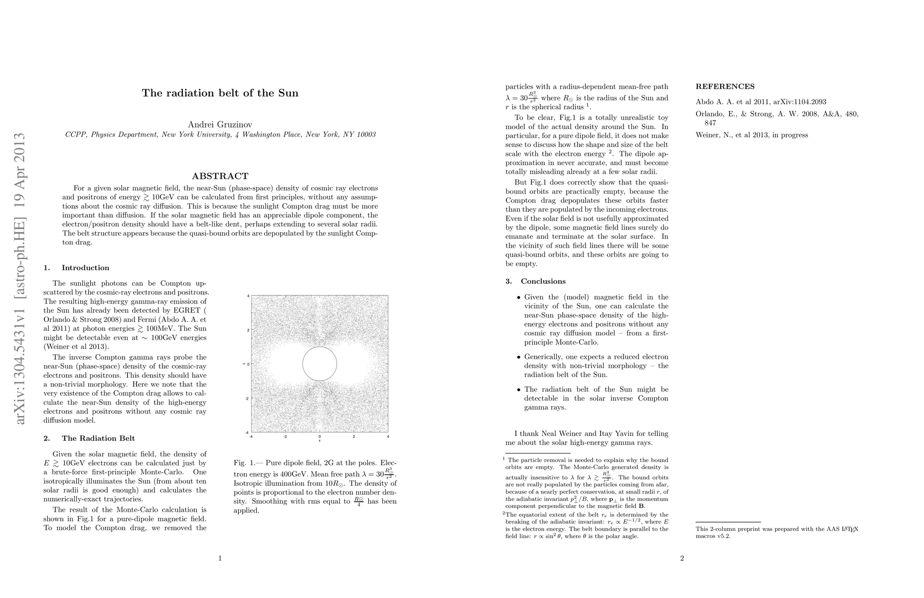 For a given solar magnetic field, the near-Sun (phase-space) density of cosmic ray electrons and positrons of energy above about 10GeV can be calculated from first principles, without any assumptions about the cosmic ray diffusion. This is because the sunlight Compton drag must be more important than diffusion. If the solar magnetic field has an appreciable dipole component, the electron/positron density should have a belt-like dent, perhaps extending to several solar radii. The belt structure appears because the quasi-bound orbits are depopulated by the sunlight Compton drag.