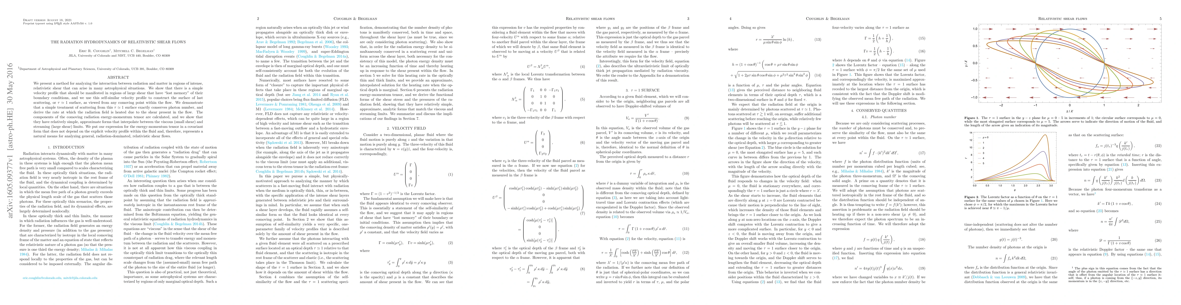 We present a method for analyzing the interaction between radiation and matter in regions of intense, relativistic shear that can arise in many astrophysical situations. We show that there is a simple velocity profile that should be manifested in regions of large shear that have "lost memory" of their boundary conditions, and we use this self-similar velocity profile to construct the surface of last scattering, or $\tau \simeq 1$ surface, as viewed from any comoving point within the flow. We demonstrate that a simple treatment of scattering from this $\tau \simeq 1$ surface exactly conserves photon number, and derive the rate at which the radiation field is heated due to the shear present in the flow. The components of the comoving radiation energy-momentum tensor are calculated, and we show that they have relatively simple, approximate forms that interpolate between the viscous (small shear) and streaming (large shear) limits. We put our expression for the energy-momentum tensor in a covariant form that does not depend on the explicit velocity profile within the fluid and, therefore, represents a natural means for analyzing general, radiation-dominated, relativistic shear flows.
