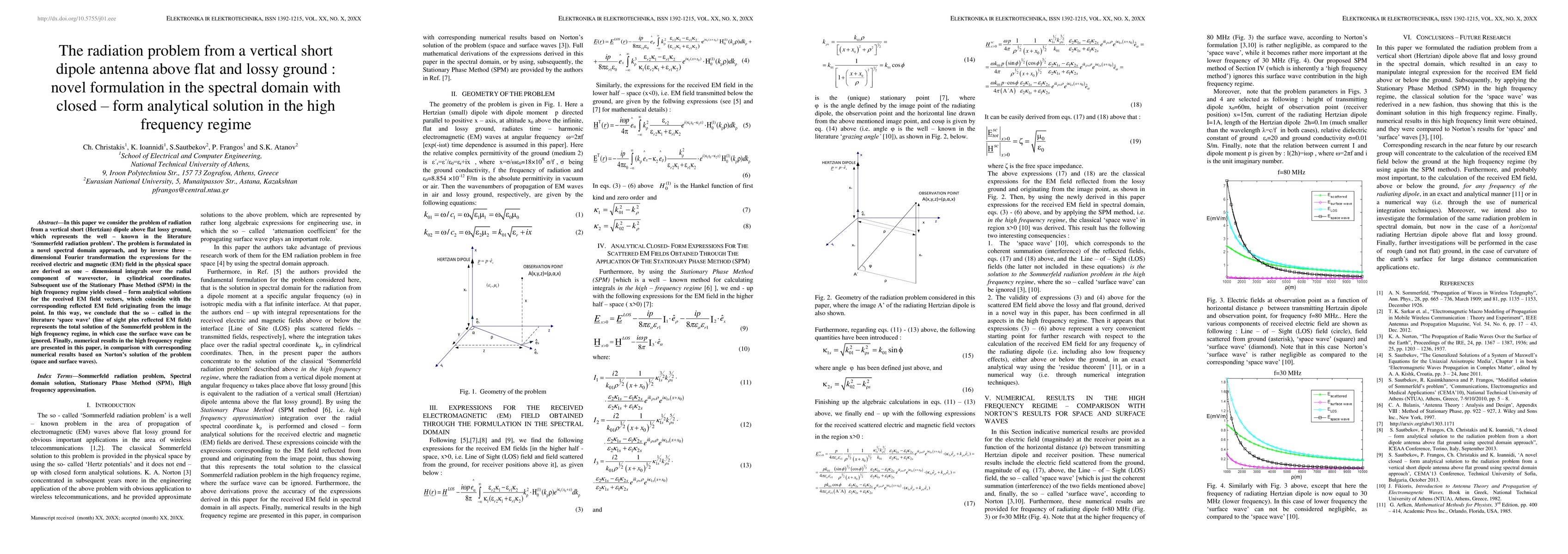 This paper presents a novel spectral domain approach to solve the Sommerfeld radiation problem for a vertical short dipole antenna above lossy ground, deriving closed form analytical solutions in the high frequency regime using the Stationary Phase Method. Numerical results show that the space wave, including reflected EM field, represents the total solution, neglecting the surface wave.