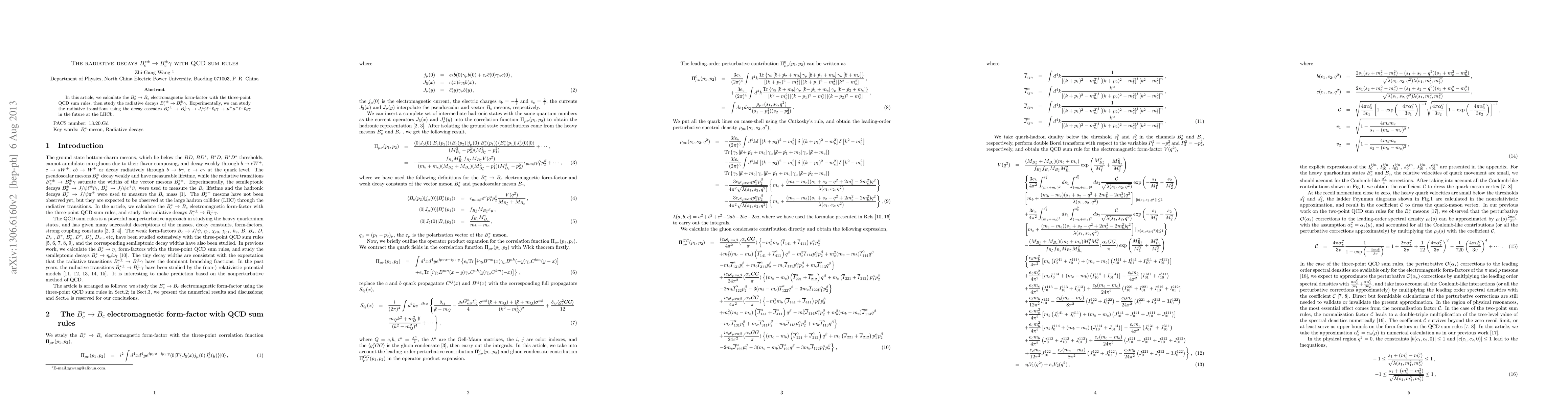 This paper calculates the electromagnetic form-factor for $B_c^* \to B_c$ decays using three-point QCD sum rules and investigates the radiative decays $B_c^{*\pm} \to B_c^{\pm} \gamma$. Future LHCb experiments may study these decays via the cascade $B_c^{*\pm}\to B_c^{\pm} \gamma\to J/\psi \ell^{\pm}\bar{\nu}_{\ell} \gamma\to \mu^+ \mu^- \ell^{\pm}\bar{\nu}_{\ell} \gamma$.