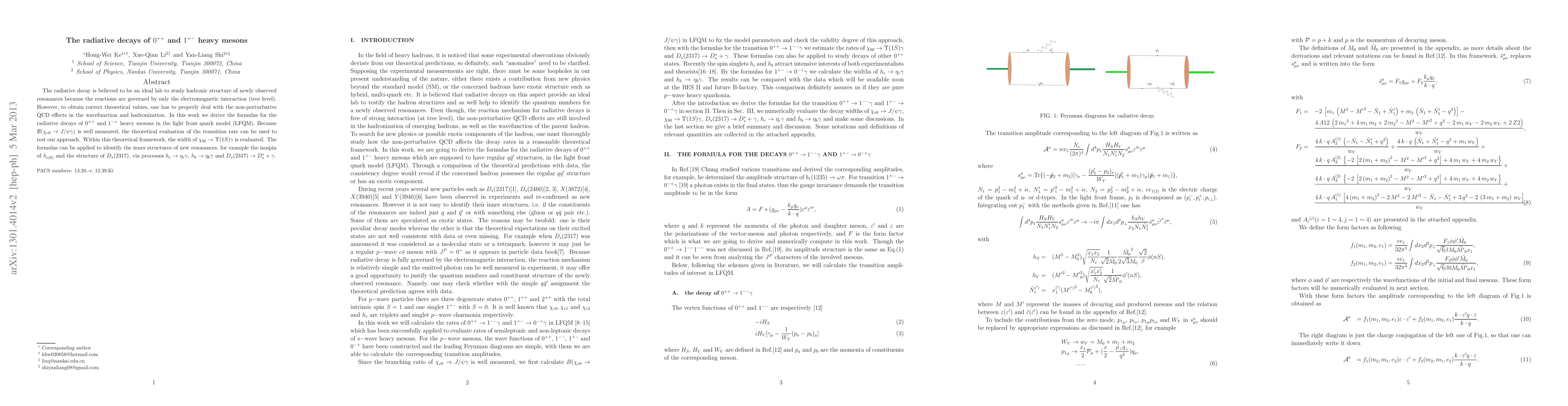 The radiative decay is believed to be an ideal lab to study hadronic structure of newly observed resonances because the reactions are governed by only the electromagnetic interaction (tree level). However, to obtain correct theoretical values, one has to properly deal with the non-perturbative QCD effects in the wavefunction and hadronization. In this work we derive the formulas for the radiative decays of $0^{++}$ and $1^{-+}$ heavy mesons in the light front quark model (LFQM). Because $\mathcal{B}(\chi_{c0}\rightarrow J/\psi\gamma)$ is well measured, the theoretical evaluation of the transition rate can be used to test our approach. Within this theoretical framework, the width of $\chi_{b0}\rightarrow \Upsilon(1S)\gamma$ is evaluated. The formulas can be applied to identify the inner structures of new resonances, for example the isospin of $h_{c(b)}$ and the structure of $D_s(2317)$, via processes $h_c\rightarrow \eta_c\gamma$, $h_b\rightarrow \eta_b\gamma$ and $D_s(2317)\rightarrow D_s^*+\gamma$.